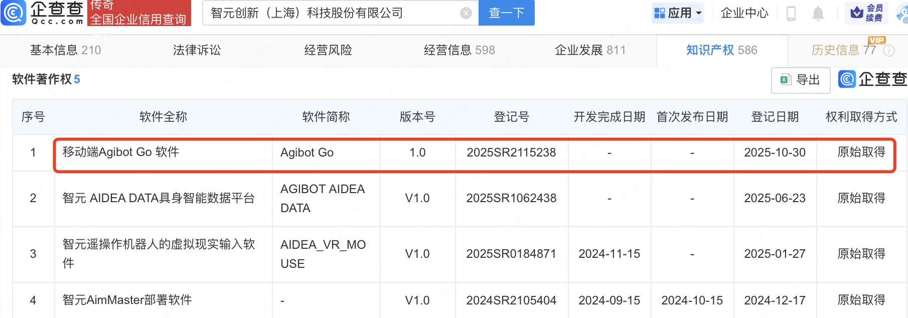 企查查APP显示,近日,智元机器人关联公司智元创新(上海)科技股份有限公司登记移动端Agibot Go软件著作权,登记号为2025SR2115238,当前版本号为1.0。