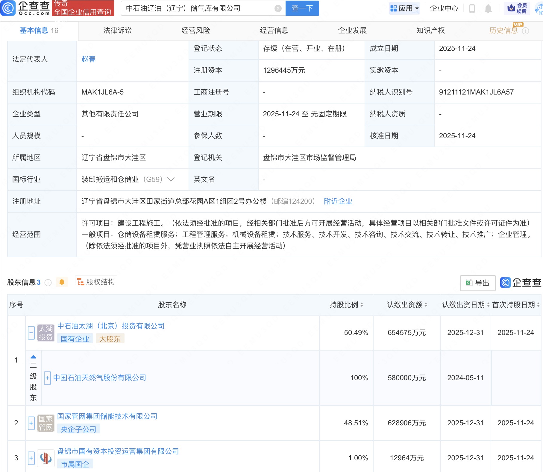 企查查APP显示,近日,中石油辽油(辽宁)储气库有限公司成立,法定代表人为赵春,注册资本约129.6亿人民币,经营范围为建设工程施工,仓储设备租赁服务,工程管理服务等。企查查股权穿透显示,该公司由中国石油(601857)全资子公司中石油太湖(北京)投资有限公司、国家管网集团储能技术有限公司等共同持股。