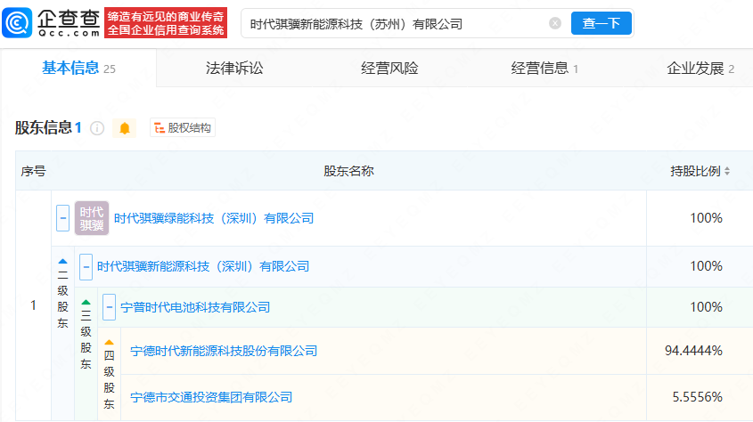 企查查APP显示,近日,时代骐骥新能源科技(盐城)有限公司成立,法定代表人为宋庆龙,经营范围包含:新兴能源技术研发;新能源汽车换电设施销售;在线能源计量技术研发;电池销售;充电桩销售等。企查查股权穿透显示,该公司由宁德时代(300750)旗下时代骐骥新能源科技(苏州)有限公司全资持股。
