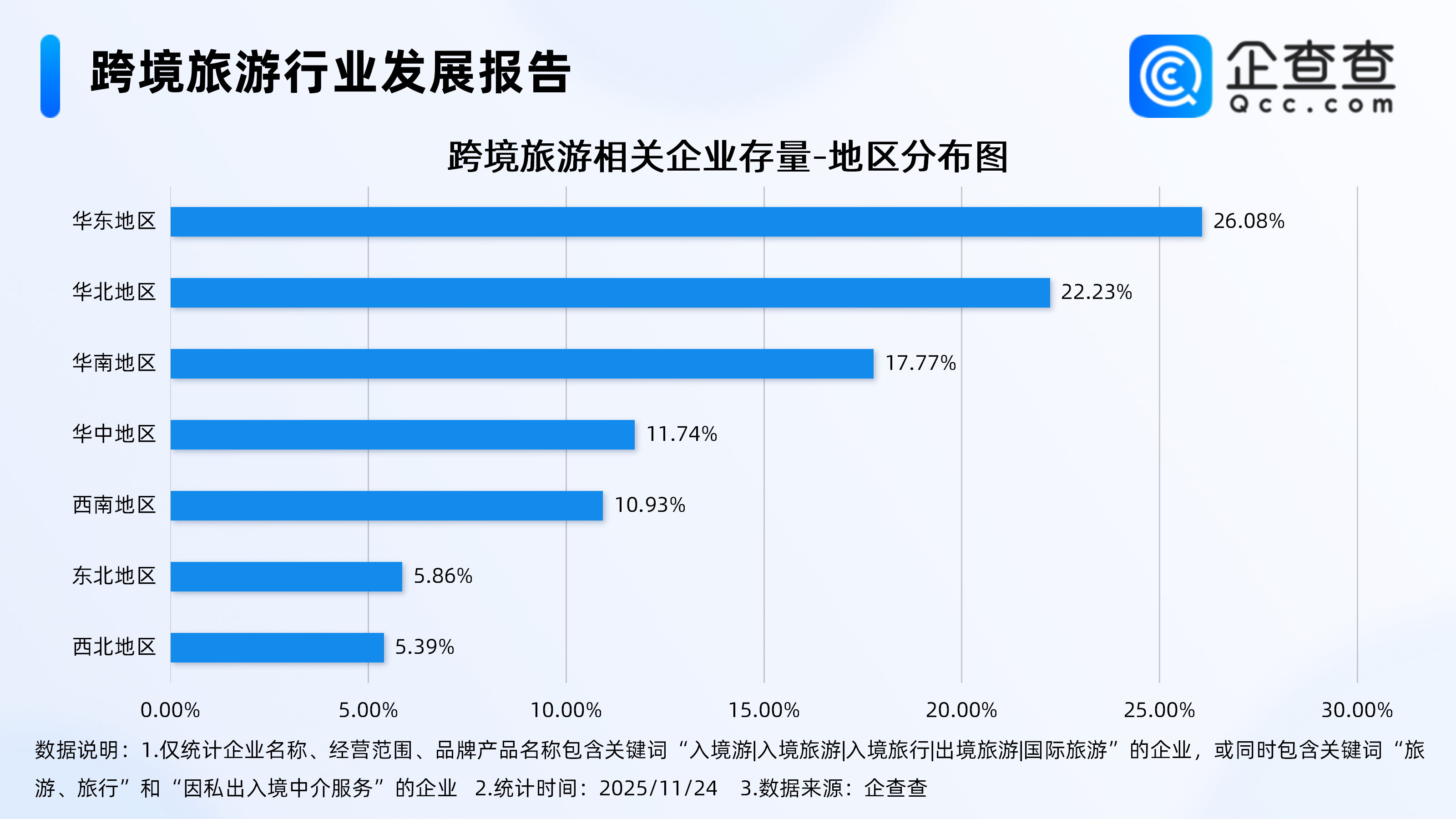 企查查数据显示,从地区分布来看,跨境旅游相关企业主要分布在华东地区,占比26.08%。其次,分布在华北地区、华南地区的跨境旅游相关企业分别占比22.23%、17.77%。