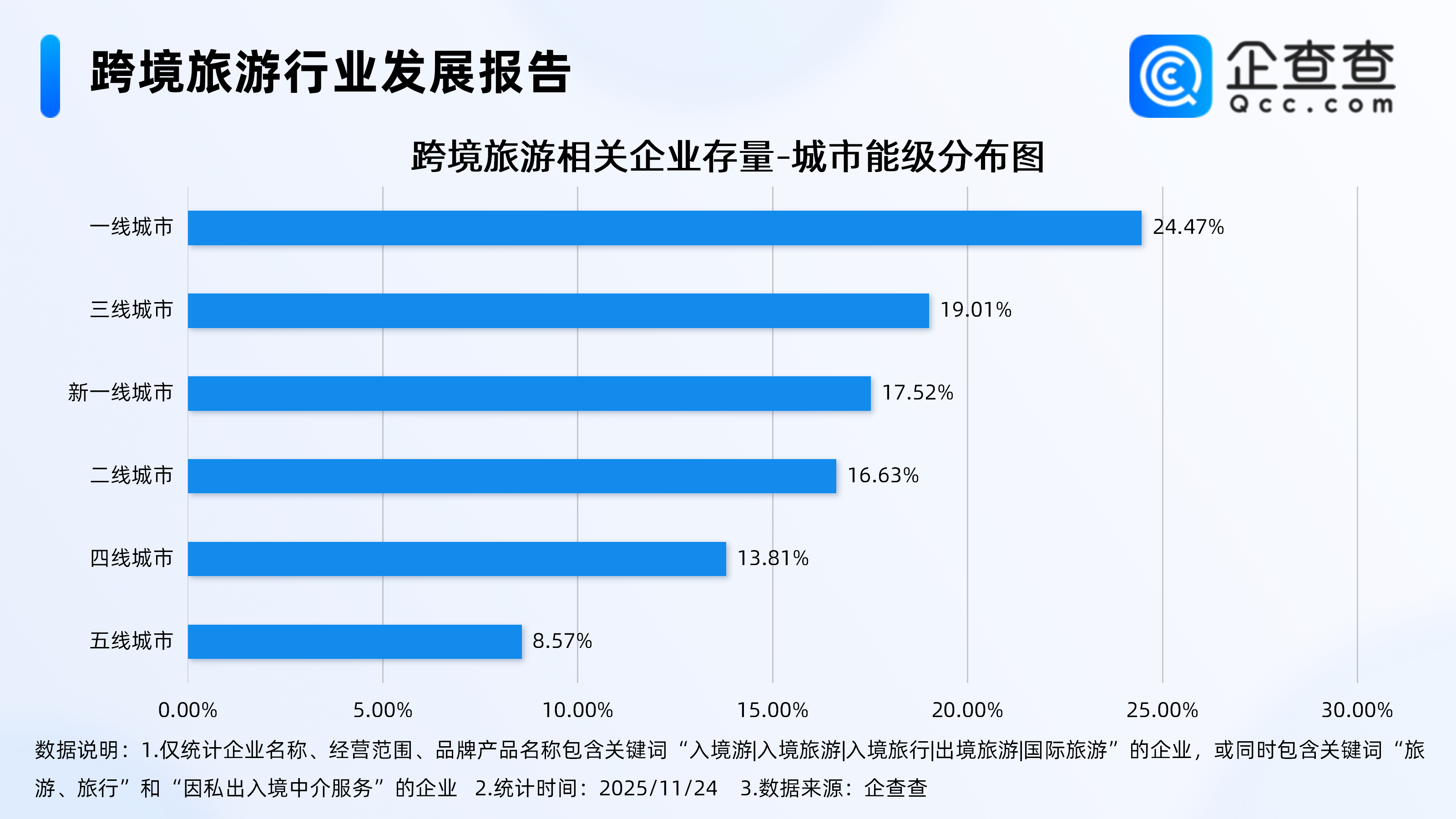 企查查数据显示,从城市能级分布来看,分布在一线城市的跨境旅游相关企业占比24.47%。其次,分布在三线城市、新一线城市的相关企业分别占比19.01%、17.52%。