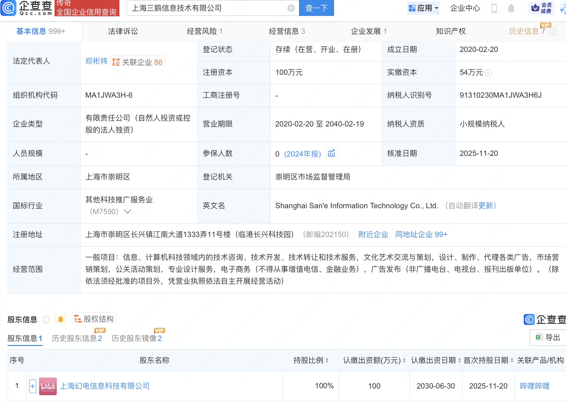 企查查APP显示,近日,上海三鹅信息技术有限公司发生工商变更,原股东上海三鹅企业管理合伙企业(有限合伙)、王宇阳退出,新增B站关联公司上海幻电信息科技有限公司为全资股东。企查查信息显示,该公司成立于2020年,经营范围包含:信息、计算机科技领域内的技术咨询、技术开发、技术转让和技术服务等。