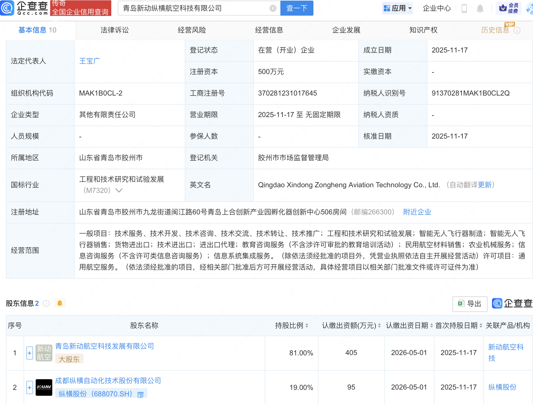 企查查APP显示,近日,青岛新动纵横航空科技有限公司成立,经营范围包含:工程和技术研究和试验发展;智能无人飞行器制造;智能无人飞行器销售;货物进出口等。企查查股权穿透显示,该公司由纵横股份(688070)等共同持股。
