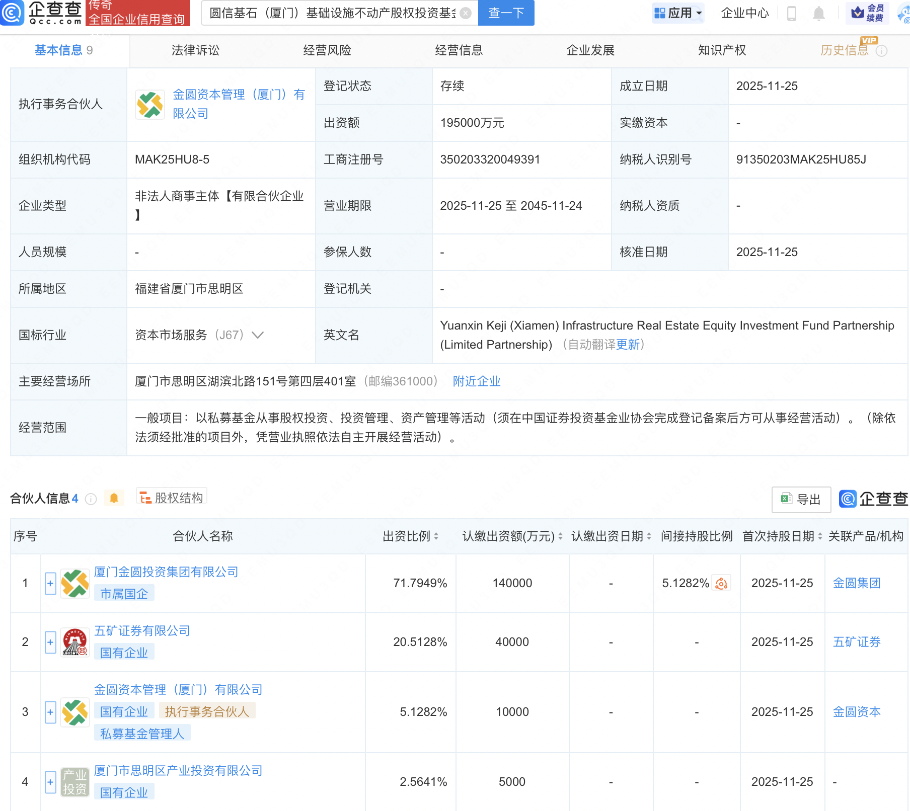 企查查APP显示,近日,圆信基石(厦门)基础设施不动产股权投资基金合伙企业(有限合伙)成立,出资额19.5亿元,经营范围包含:以私募基金从事股权投资、投资管理、资产管理等活动。企查查股权穿透显示,该企业由厦门金圆投资集团有限公司、五矿证券有限公司等共同出资。