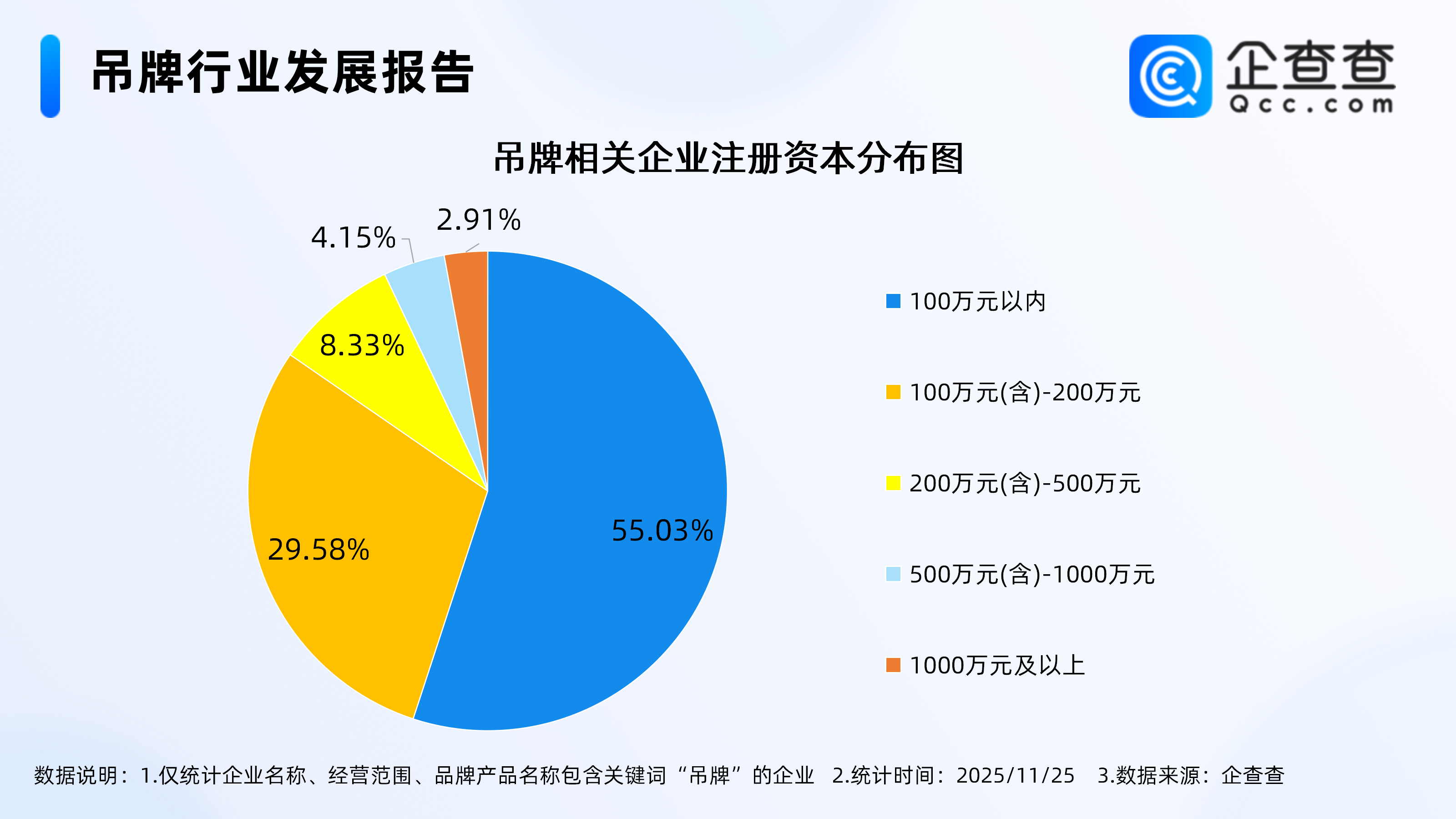 企查查数据显示,从注册资本来看,吊牌相关企业多以轻量级为主,注册资本在100万元以内的相关企业最多,占比达55.03%。其次,注册资本在100万元(含)-200万元的相关企业占比29.58%。注册资本在1000万元及以上的相关企业占比仅2.91%。