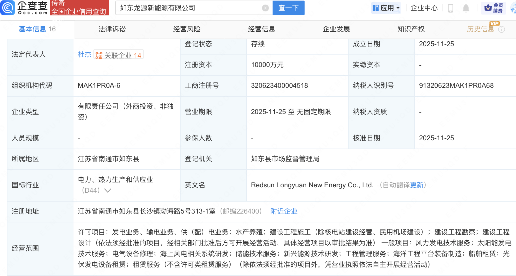 企查查APP显示,近日,如东龙源新能源有限公司成立,注册资本1亿元,经营范围包含:风力发电技术服务;太阳能发电技术服务;电气设备修理;海上风电相关系统研发;储能技术服务等。企查查股权穿透显示,该公司由龙源电力(001289)、国家能源集团江苏电力有限公司、远东股份(600869)全资子公司远东海缆有限公司、东方电气(600875)旗下东方电气风电股份有限公司等共同持股。