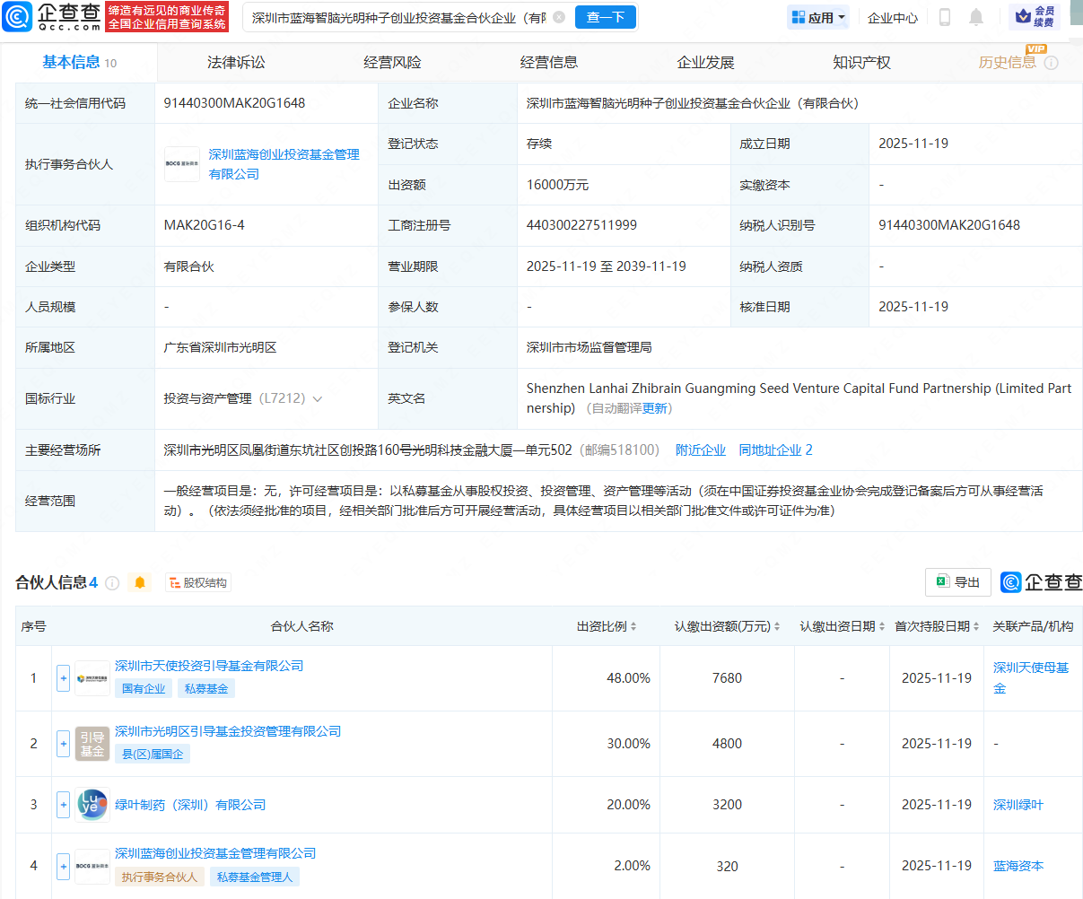 企查查APP显示,近日,深圳市蓝海智脑光明种子创业投资基金合伙企业(有限合伙)成立,出资额1.6亿元,经营范围包含:以私募基金从事股权投资、投资管理、资产管理等活动。企查查股权穿透显示,该合伙企业由深圳市天使投资引导基金有限公司、绿叶制药(深圳)有限公司等共同持股。