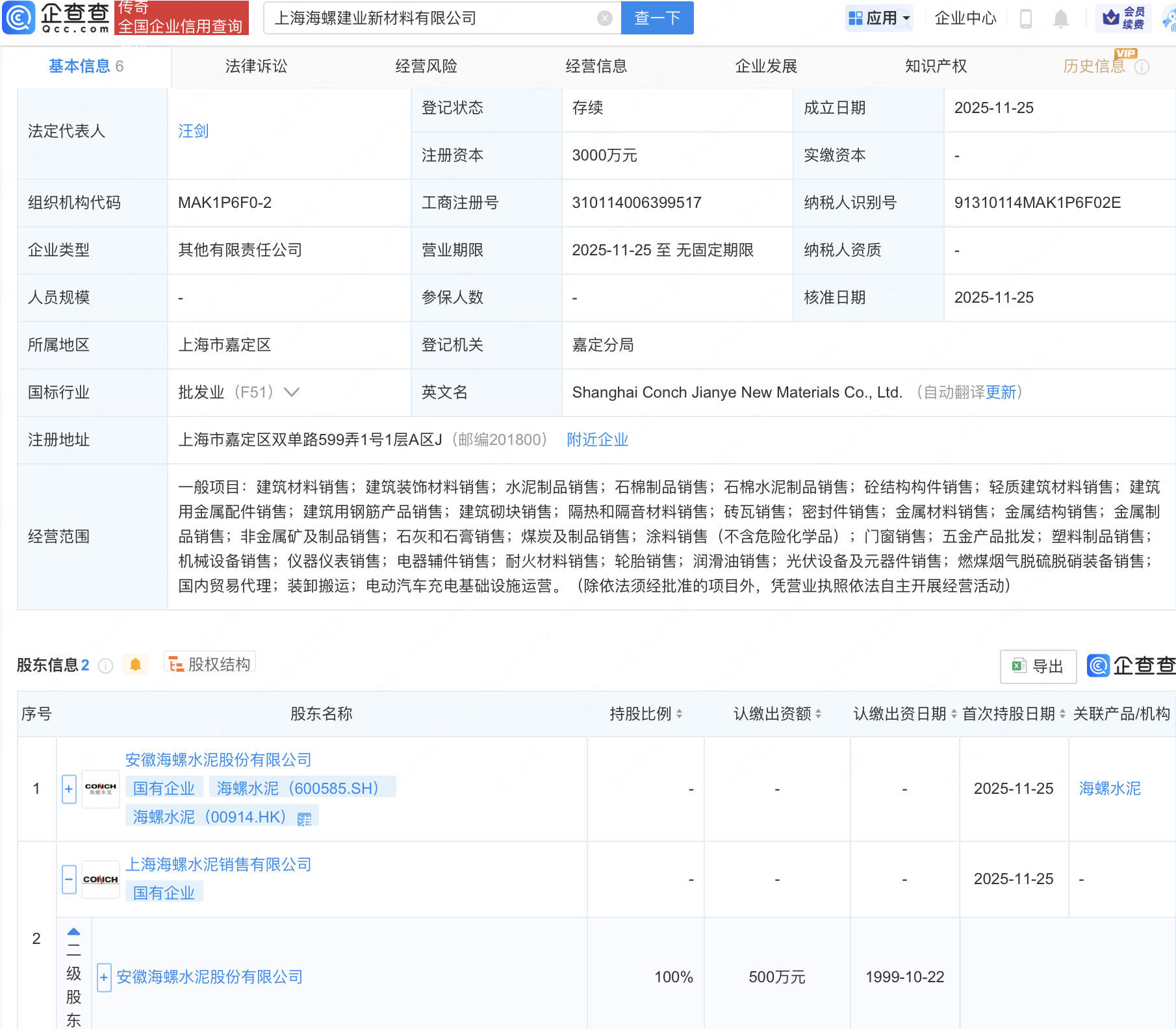 企查查APP显示,近日,上海海螺建业新材料有限公司成立,注册资本3000万元,经营范围包含:国内贸易代理;装卸搬运;电动汽车充电基础设施运营等。企查查股权穿透显示,该公司由海螺水泥(600585)间接全资持股。