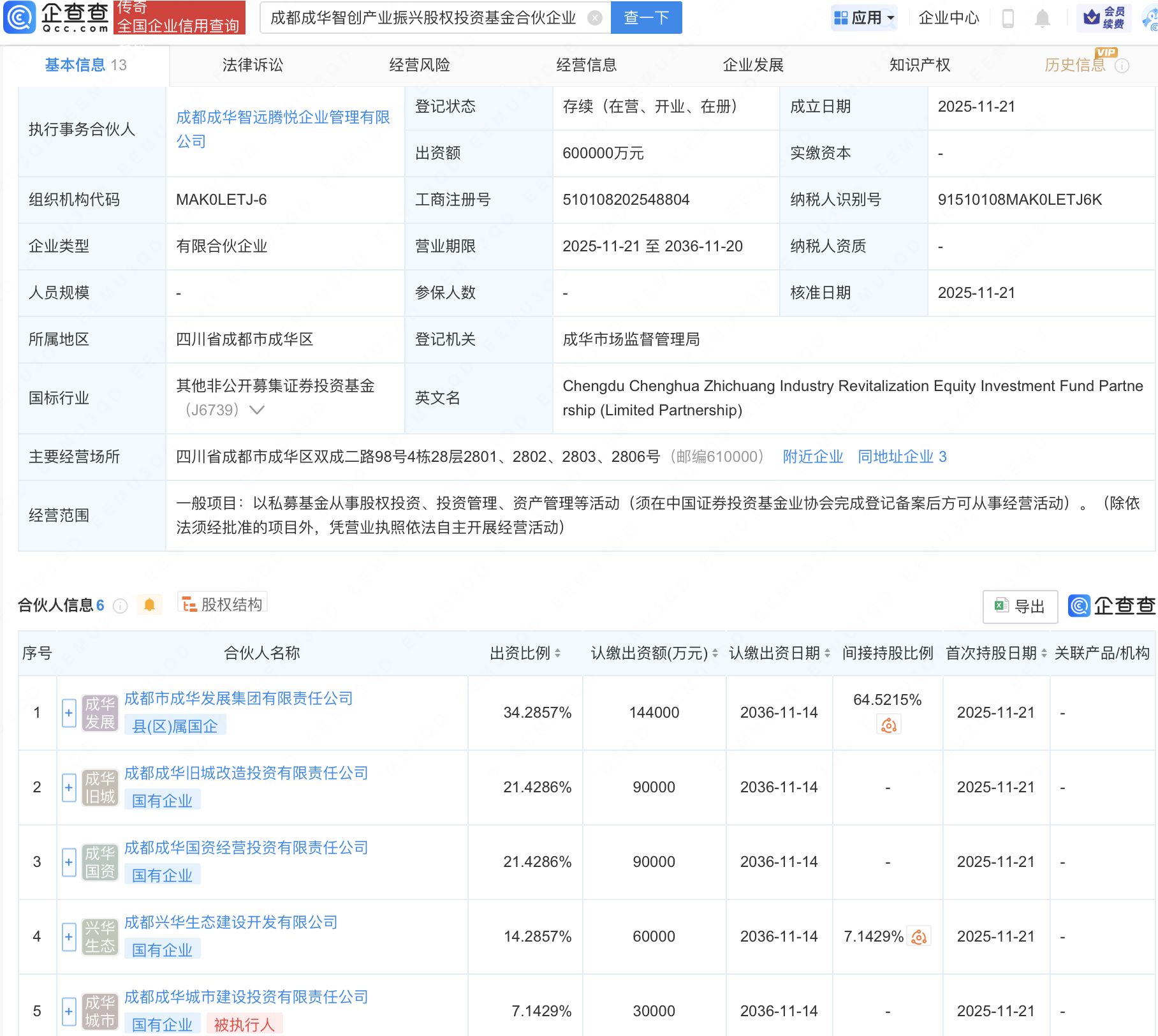 企查查APP显示,近日,成都成华智创产业振兴股权投资基金合伙企业(有限合伙)成立,出资额60亿元,经营范围包含:以私募基金从事股权投资、投资管理、资产管理等活动。企查查股权穿透显示,该企业由成都市成华发展集团有限责任公司、成都成华国资经营投资有限责任公司等共同出资。