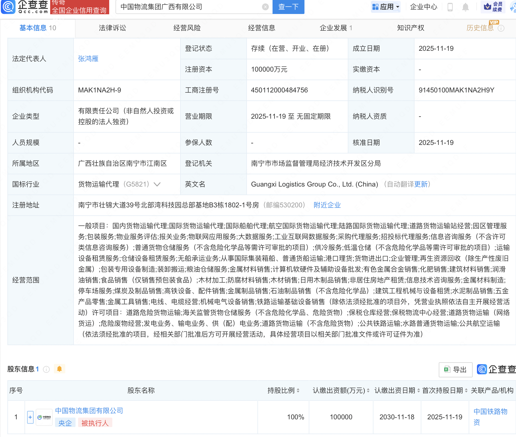 企查查APP显示,近日,中国物流集团广西有限公司成立,注册资本10亿元,经营范围包含:国际船舶代理;航空国际货物运输代理;陆路国际货物运输代理;道路货物运输站经营等。企查查股权穿透显示,该公司由中国物流集团有限公司全资持股。