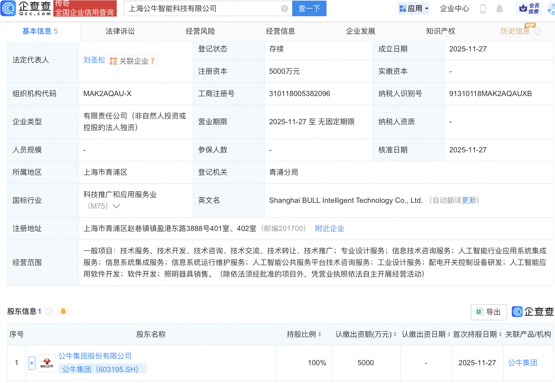 企查查APP显示,近日,上海公牛智能科技有限公司成立,注册资本5000万元,经营范围包含:人工智能行业应用系统集成服务;人工智能公共服务平台技术咨询服务;人工智能应用软件开发等。企查查股权穿透显示,该公司由公牛集团(603195)全资持股。