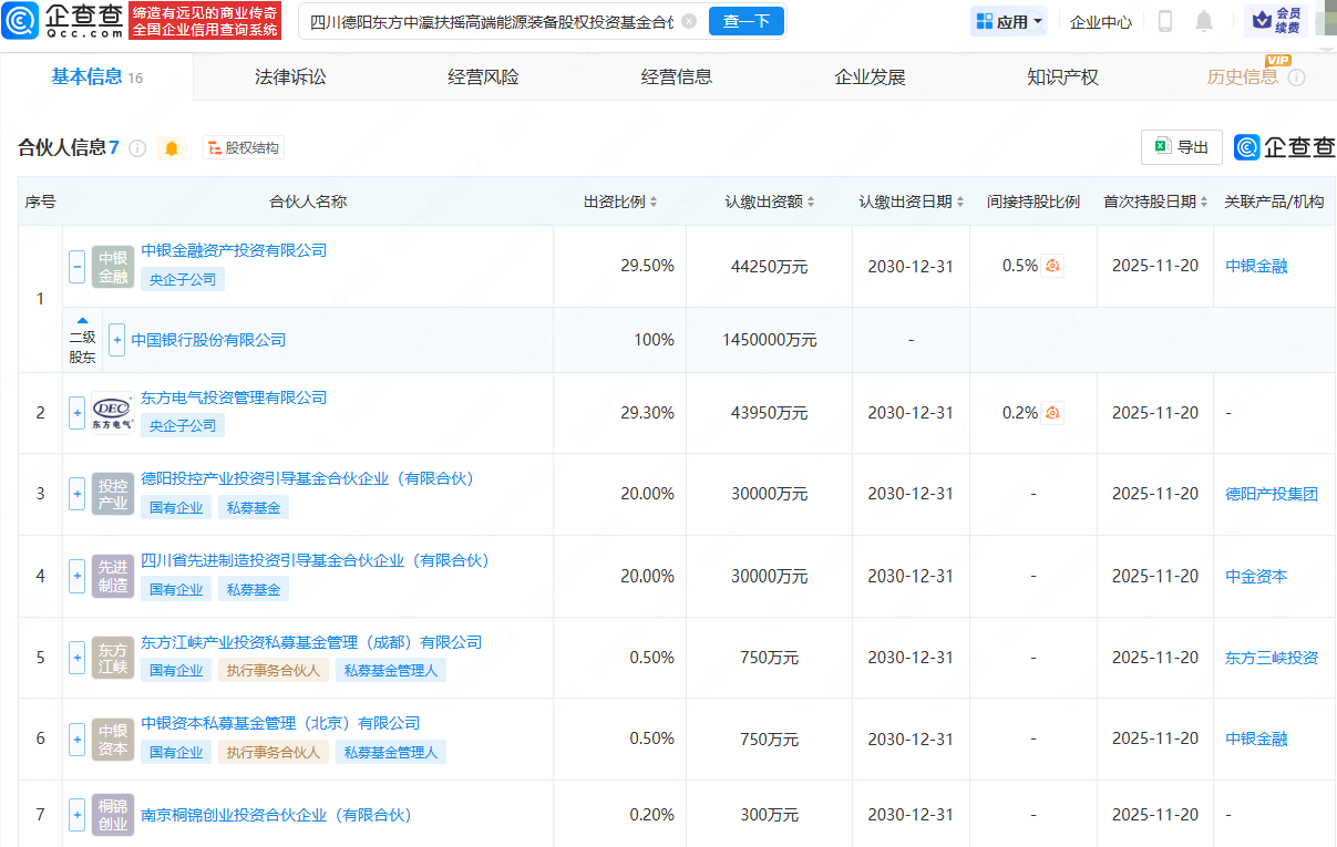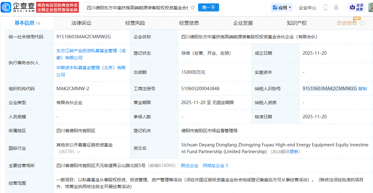 企查查APP显示,近日,四川德阳东方中瀛扶摇高端能源装备股权投资基金合伙企业(有限合伙)成立,出资额15亿元,经营范围包含:以私募基金从事股权投资、投资管理、资产管理等活动。企查查股权穿透显示,该公司由中国银行(601988)全资子公司中银金融资产投资有限公司、东方电气投资管理有限公司等共同持股。
