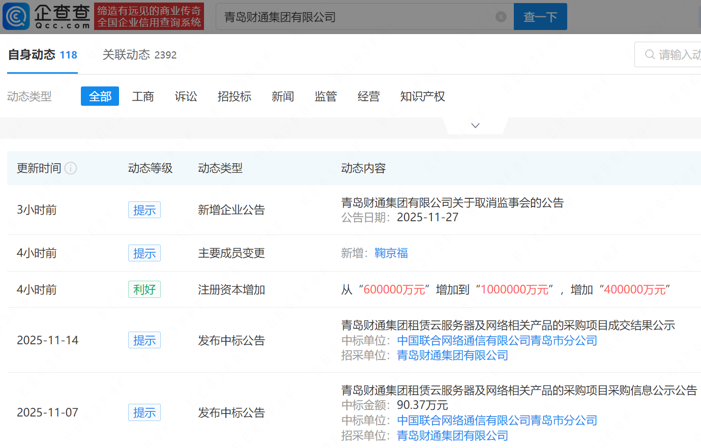 企查查APP显示,近日,青岛财通集团有限公司发生工商变更,注册资本由60亿增至100亿元,增幅约67%。企查查信息显示,该公司成立于2020年9月,法定代表人王振海,经营范围包含资产及股权的投资与并购、运营与管理等,由青岛市财政局全资持股。