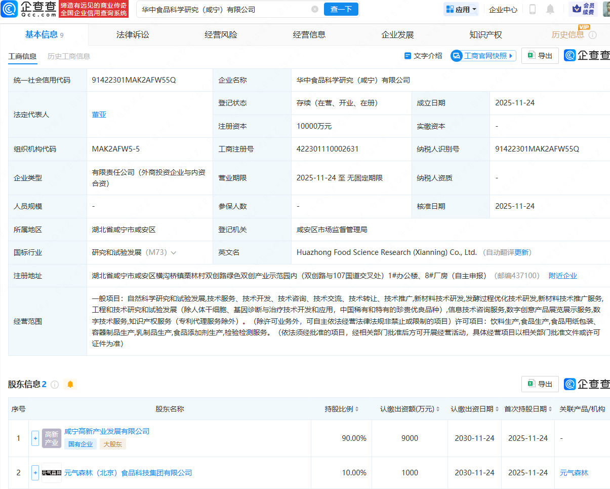 企查查APP显示,近日,华中食品科学研究(咸宁)有限公司成立,法定代表人为董亚,注册资本为1亿元,经营范围包含:自然科学研究和试验发展;新材料技术研发;发酵过程优化技术研发;新材料技术推广服务等。企查查股权穿透显示,该公司由咸宁高新产业发展有限公司、元气森林(北京)食品科技集团有限公司共同持股。
