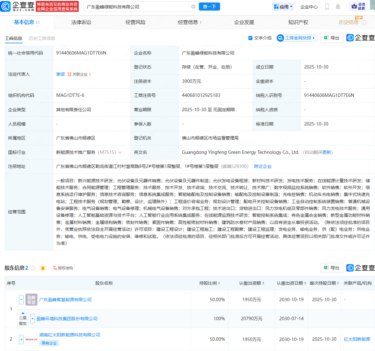 企查查APP显示,近日,广东盈峰绿能科技有限公司成立,法定代表人为谢波,注册资本为3900万元,经营范围包含:光伏设备及元器件销售;光伏设备及元器件制造;光伏发电设备租赁;储能技术服务;充电桩销售等。企查查股权穿透显示,该公司由盈峰环境(000967)全资子公司广东盈峰智慧能源有限公司、湖南红太阳新能源科技有限公司共同持股。