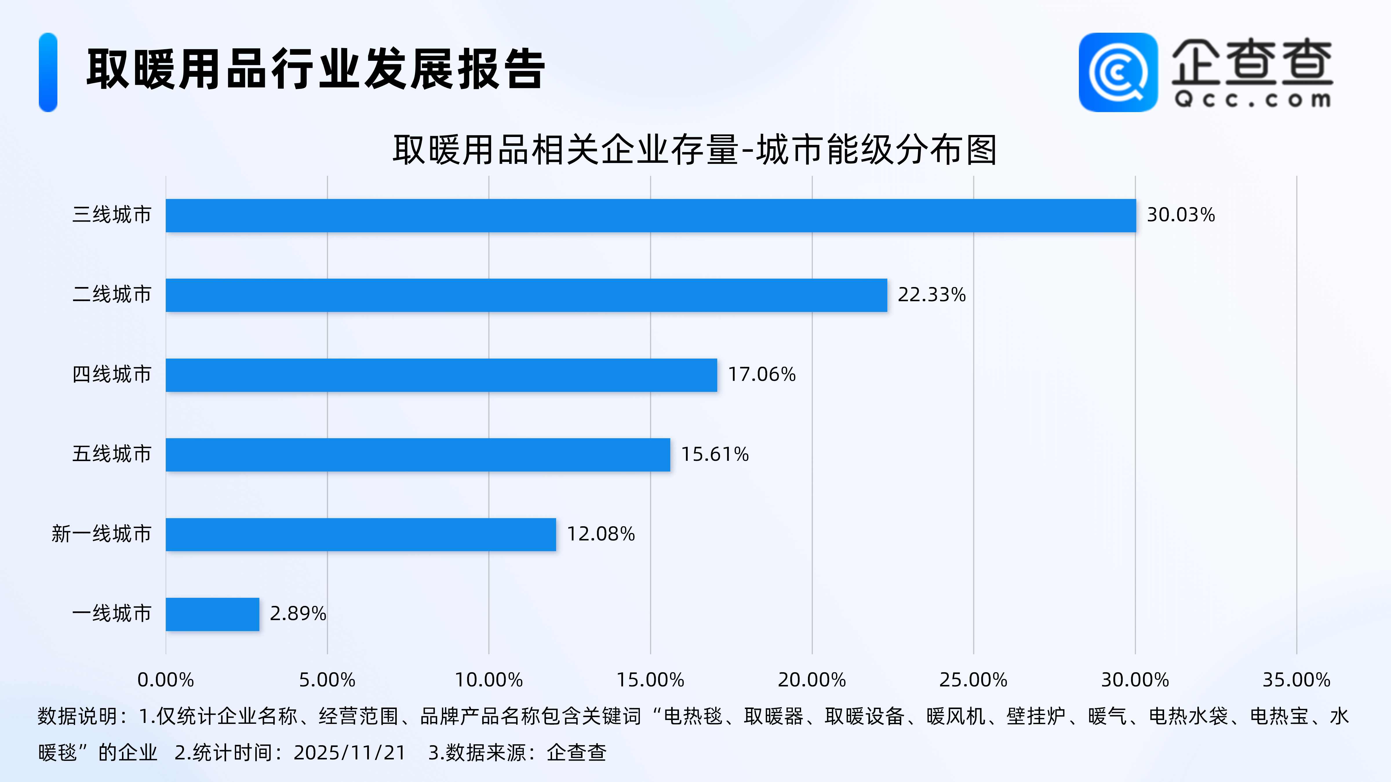 企查查数据显示,截至11月21日,国内现存取暖用品相关企业4.95万家。从经营时间来看,取暖用品相关企业多为老牌企业,成立年限在5-10年的相关企业占比过半,达54.65%。从城市能级分布来看,分布在三线城市的取暖用品相关企业最多,占比30.03%。注册量方面,2024年全年注册252家相关企业,截至目前,今年已注册152家。