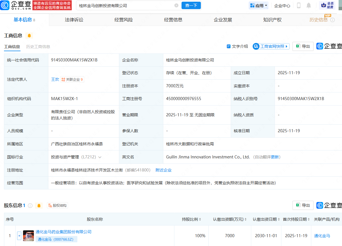 企查查APP显示,近日,桂林金马创新投资有限公司成立,法定代表人为王欢,注册资本为7000万元,经营范围包含:以自有资金从事投资活动;医学研究和试验发展。企查查股权穿透显示,该公司由通化金马(000766)全资持股。