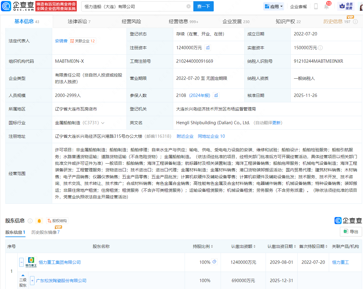 企查查APP显示,近日,恒力造船(大连)有限公司发生工商变更,注册资本由100亿元增至124亿元,增幅24%。该公司成立于2022年7月,法定代表人为安锦香,经营范围包含非金属船舶制造、船舶制造、船舶修理等,企查查股权穿透显示,恒力造船(大连)有限公司由恒力重工集团有限公司全资持股,后者为*ST松发(603268)全资子公司。