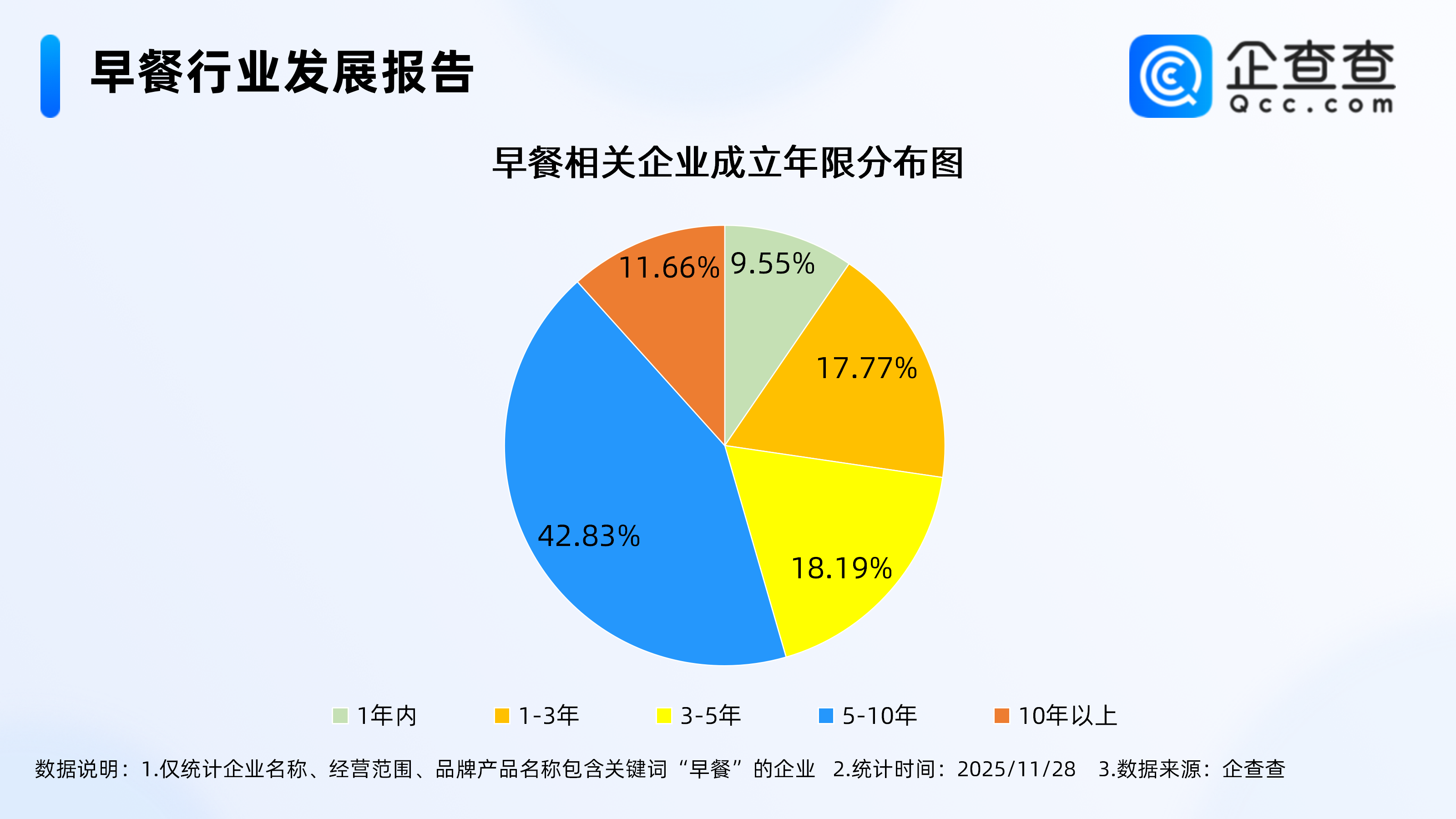 企查查数据显示,截至11月28日,国内现存早餐相关企业28.48万家。从经营时间来看,成立年限在5-10年的早餐相关企业最多,占比42.83%。其次,成立年限在3-5年、1-3年的相关企业分别占比18.19%、17.77%。