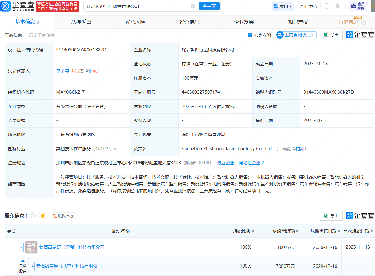 企查查APP显示,近日,深圳智识行达科技有限公司成立,法定代表人为李子夷,经营范围包含:智能机器人销售;工业机器人销售;服务消费机器人销售;智能机器人的研发;人工智能硬件销售等。企查查股权穿透显示,该公司由新石器慧通(北京)科技有限公司间接全资持股。
