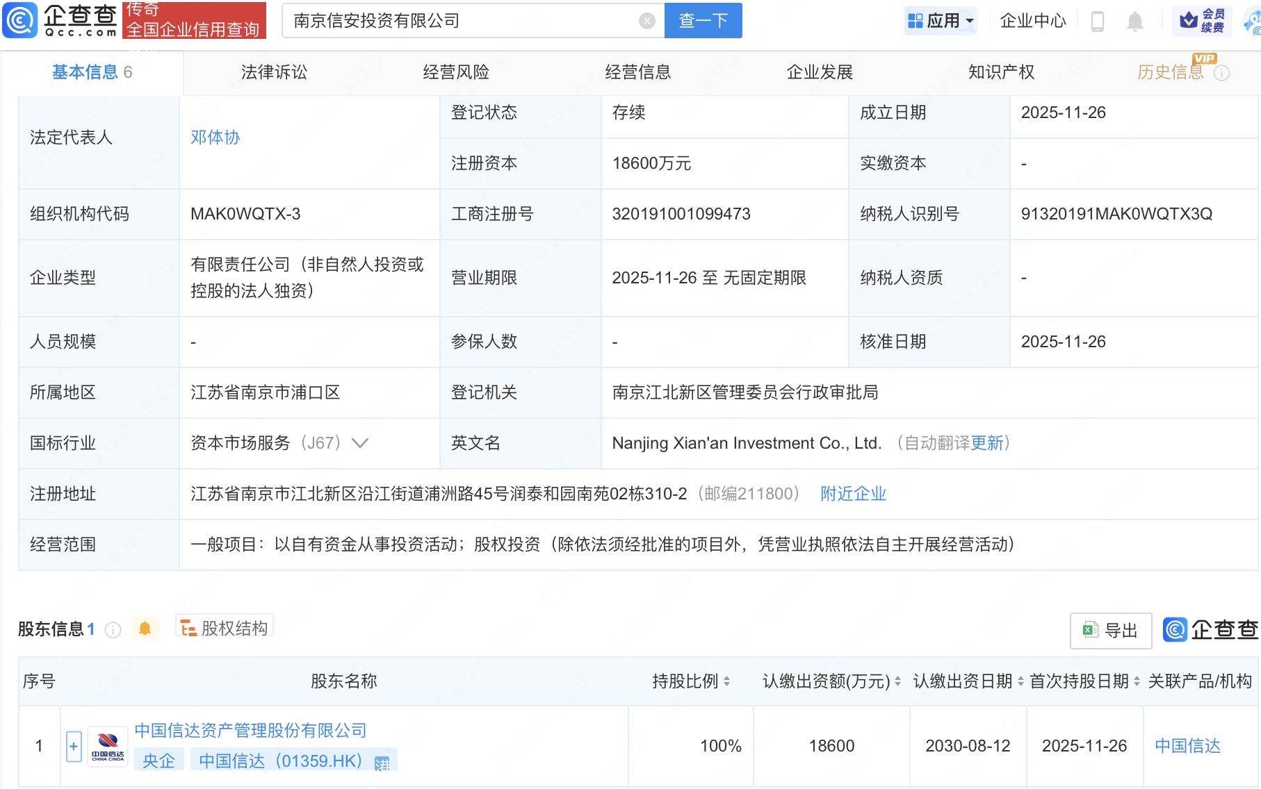 企查查APP显示,近日,南京信安投资有限公司成立,注册资本1.86亿元,经营范围包含:以自有资金从事投资活动;股权投资。企查查股权穿透显示,该公司由中国信达(01359.HK)全资持股。