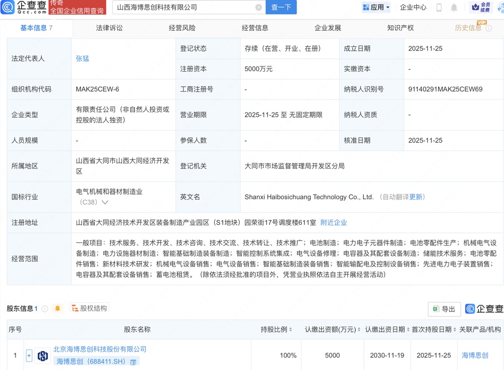 企查查APP显示,近日,山西海博思创科技有限公司成立,法定代表人为张猛,注册资本5000万人民币,经营范围包括电池制造、电力电子元器件制造、电池零配件生产、机械电气设备制造、智能基础制造装备制造等。企查查股权穿透显示,该公司由海博思创(688411)全资持股。