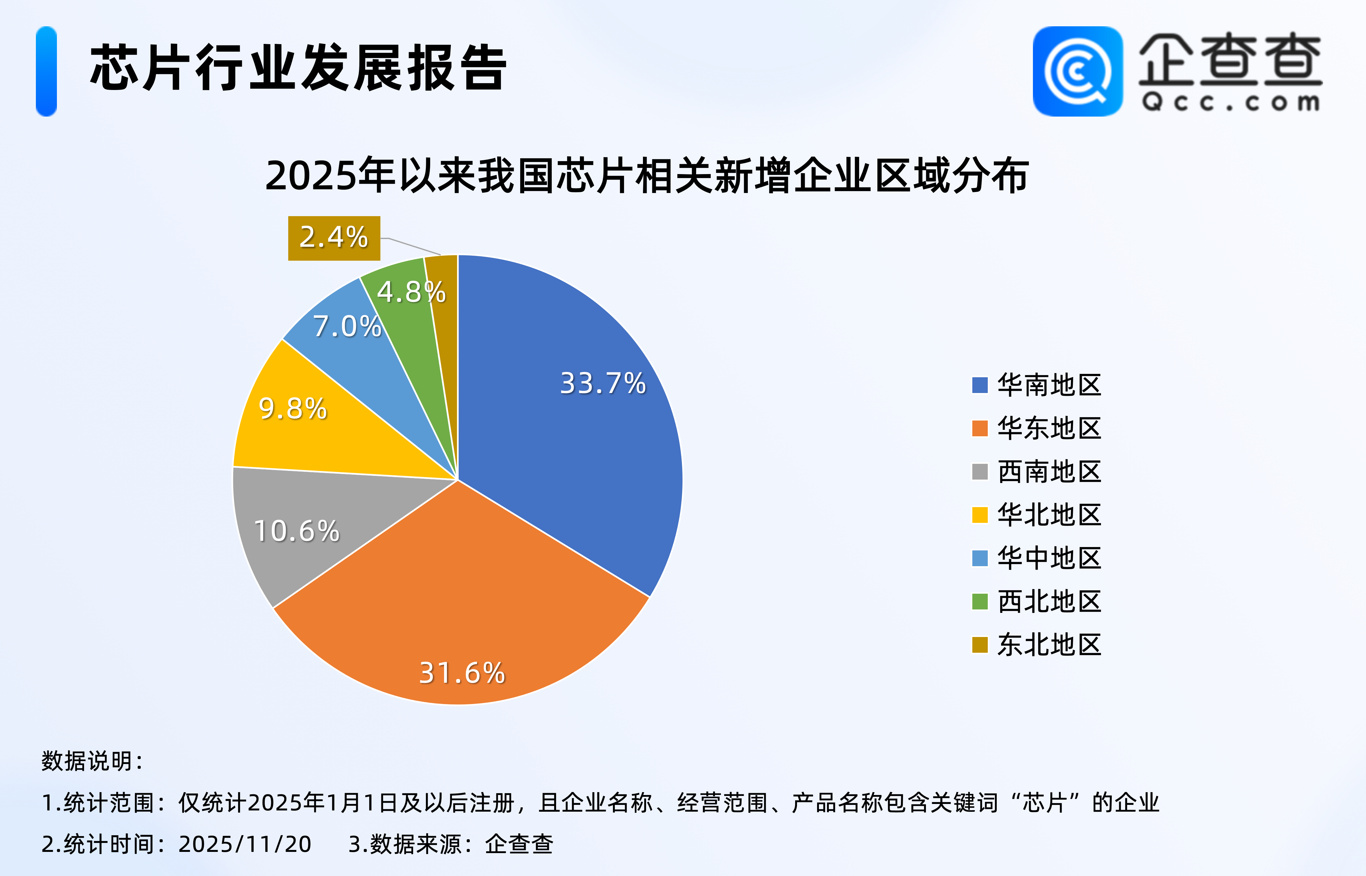 企查查数据显示,2025年以来新注册的芯片相关企业中,分布在华南地区的最多,占比33.7%,其次是华东地区,占比31.6%,西北、东北地区相对较少,分占4.8%、2.4%。