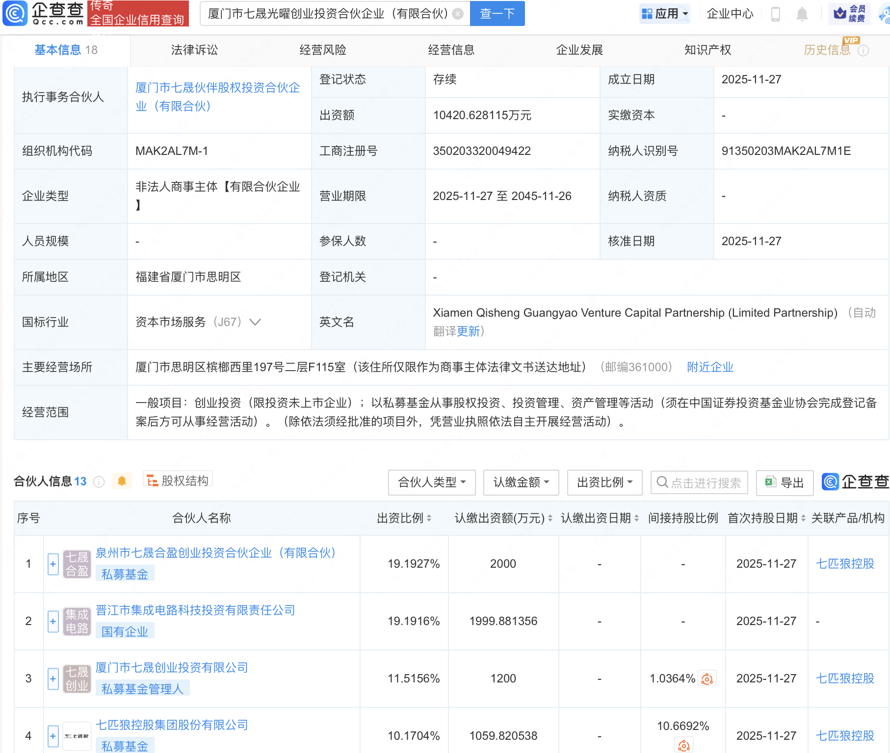 企查查APP显示,近日,厦门市七晟光曜创业投资合伙企业(有限合伙)成立,出资额1.04亿元,经营范围包含:创业投资(限投资未上市企业);以私募基金从事股权投资、投资管理、资产管理等活动。企查查股权穿透显示,该企业由七匹狼控股集团股份有限公司等共同出资。