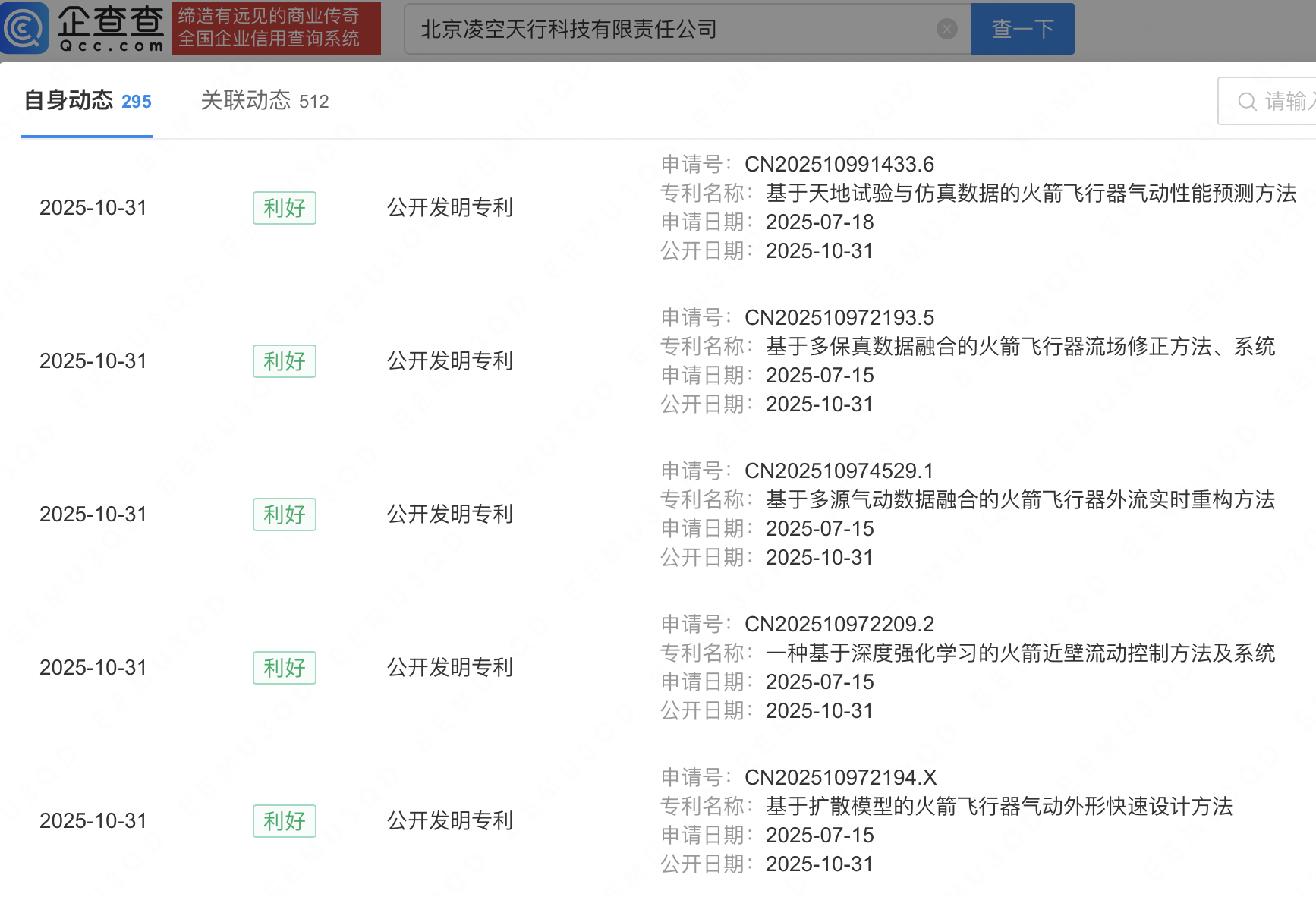 企查查APP显示,近日,北京凌空天行科技有限责任公司公开多个火箭设计专利,其中包括“基于扩散模型的火箭飞行器气动外形快速设计方法”、“一种基于深度强化学习的火箭近壁流动控制方法及系统”、“基于多源气动数据融合的火箭飞行器外流实时重构方法”等。