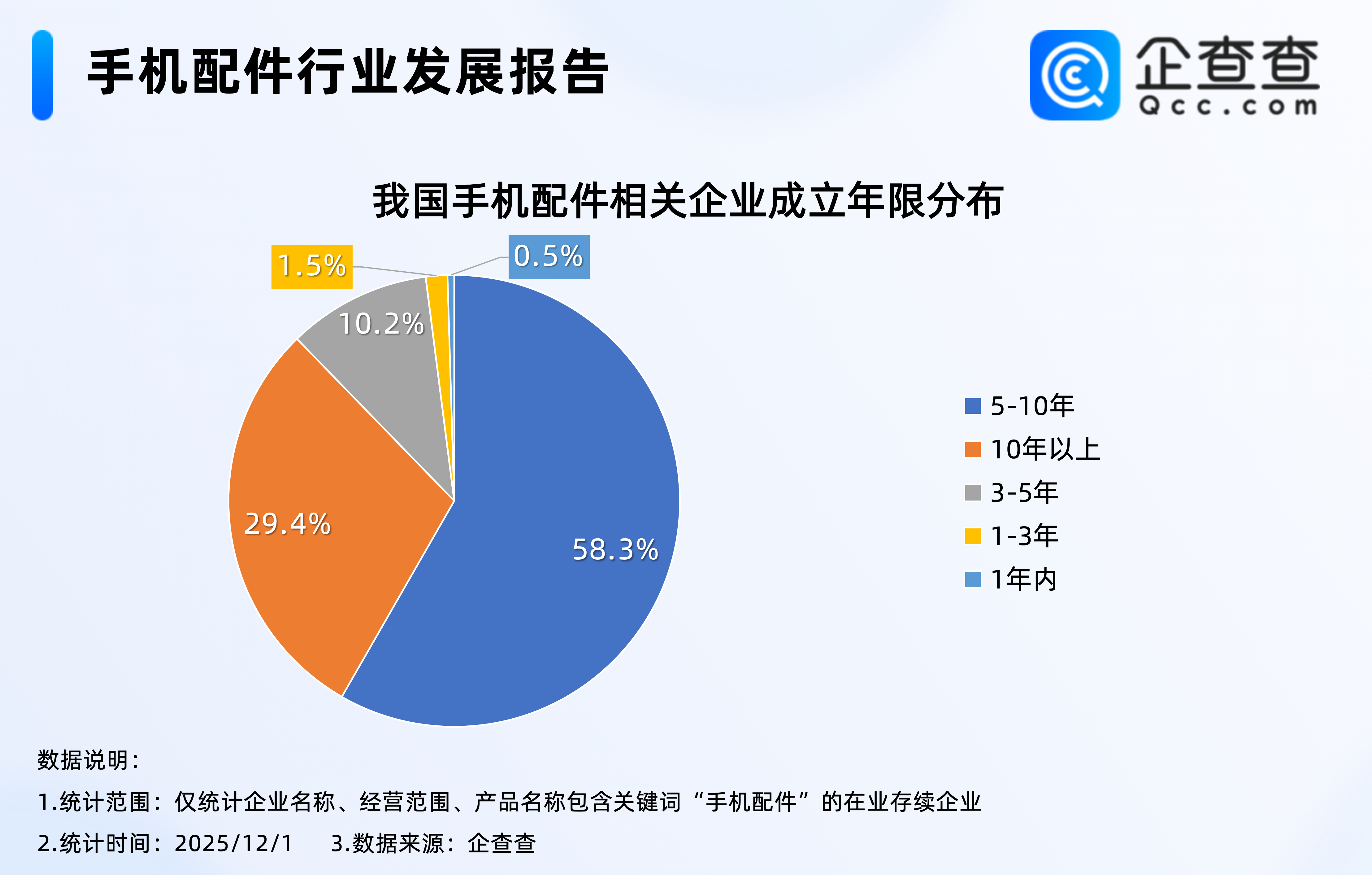 企查查数据显示,成立年限上,我国手机配件领域以老牌企业为主,成立5年以上的企业合计占比87.7%,其中成立超10年的企业占比29.4%。