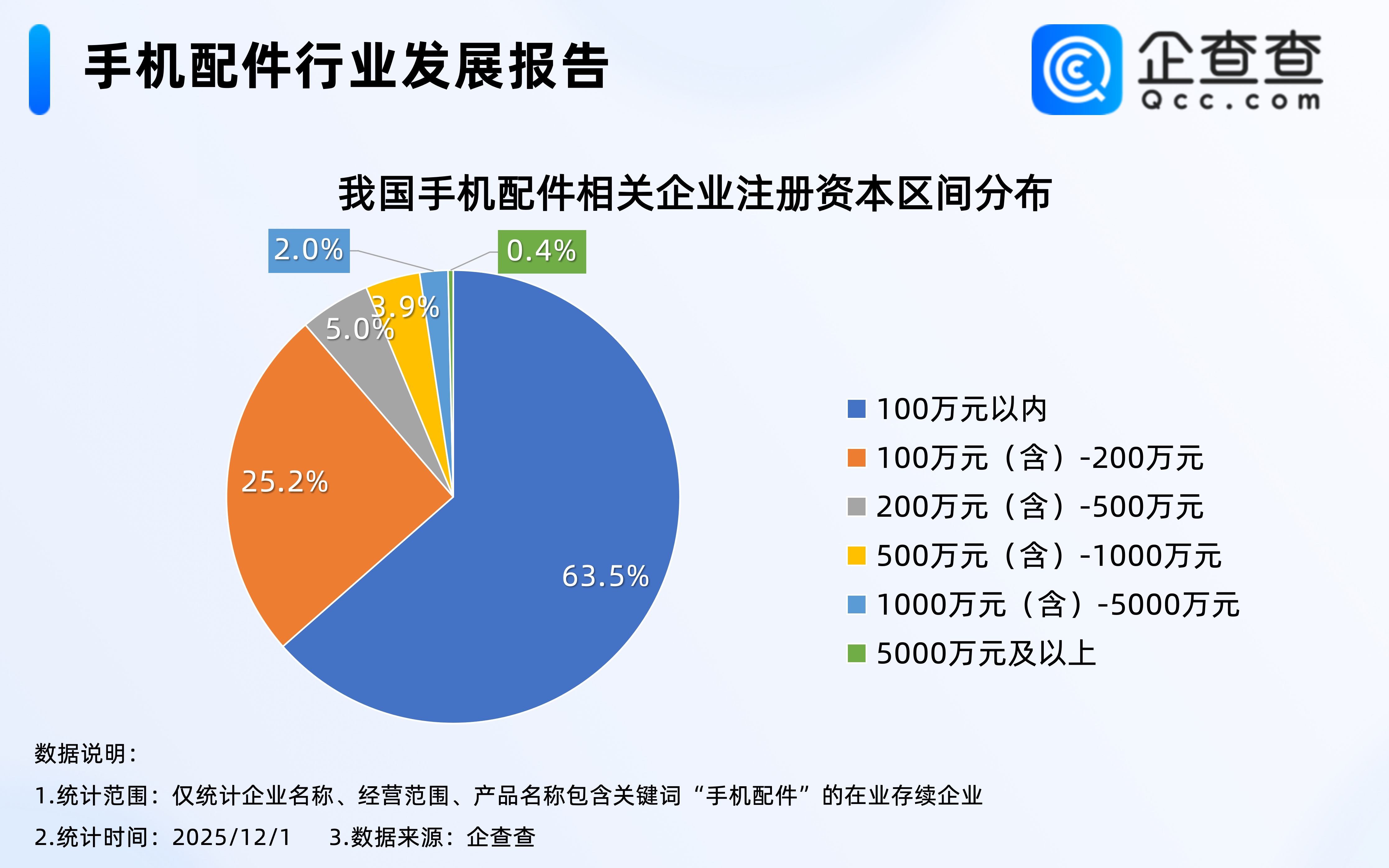 企查查数据显示,我国手机配件属轻资本领域,公示注册资本的在业存续企业中,超六成企业注册资本在100万元以内,占比达63.5%,其次是注册资本在100万元(含)至200万元之间的企业,占比25.2%。