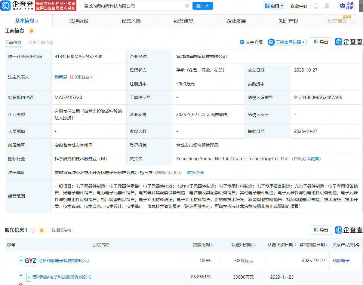 企查查APP显示,近日,宣城昀海电陶科技有限公司成立,法定代表人为颜荣崑,注册资本为5000万元,经营范围包含:电子元器件制造;电子元器件零售;电子元器件批发;电力电子元器件制造等。企查查股权穿透显示,该公司由昀冢科技(688260)旗下池州昀冢电子科技有限公司全资持股。