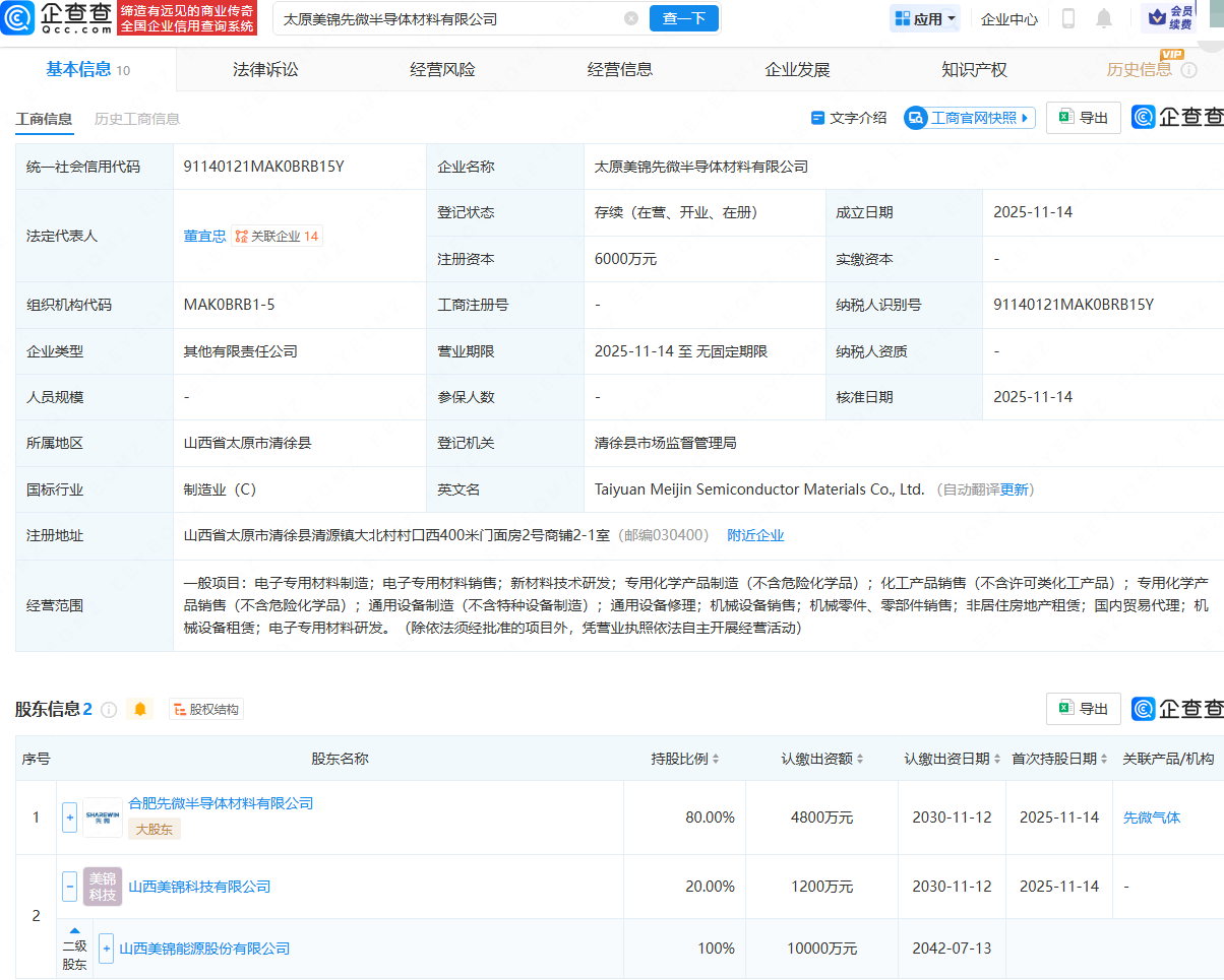 企查查APP显示,近日,太原美锦先微半导体材料有限公司成立,法定代表人为董宜忠,注册资本为6000万元,经营范围包含:电子专用材料制造;新材料技术研发;专用化学产品制造(不含危险化学品);通用设备修理等。企查查股权穿透显示,该公司由合肥先微半导体材料有限公司、美锦能源(000723)全资子公司山西美锦科技有限公司共同持股。
