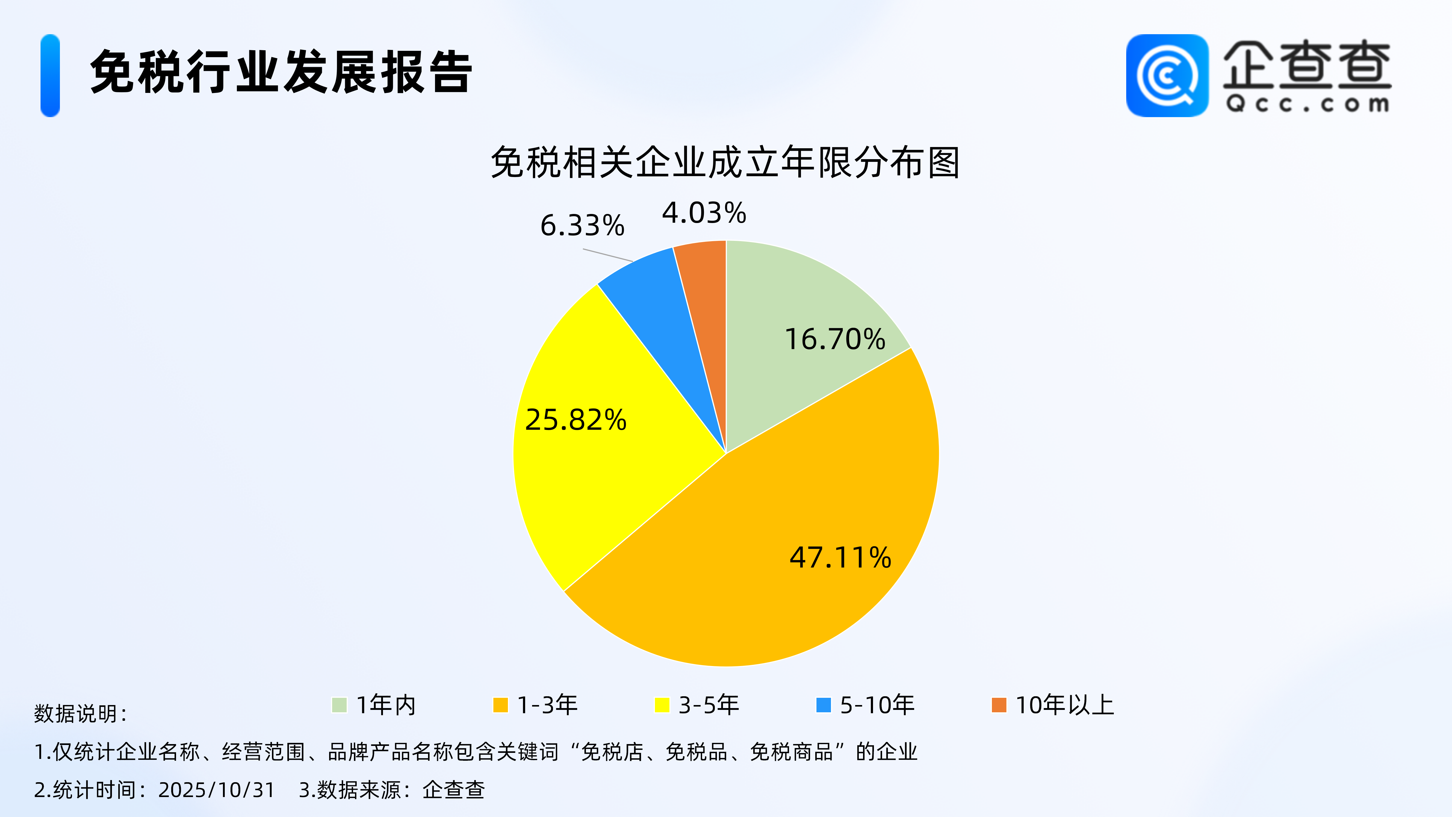企查查数据显示,从经营时间来看,免税相关企业多成立于近三年,其中,成立年限在1-3年的相关企业最多,占比47.11%,成立年限在1年内的相关企业占比16.70%。此外,成立年限在3-5年的相关企业占比达25.82%。
