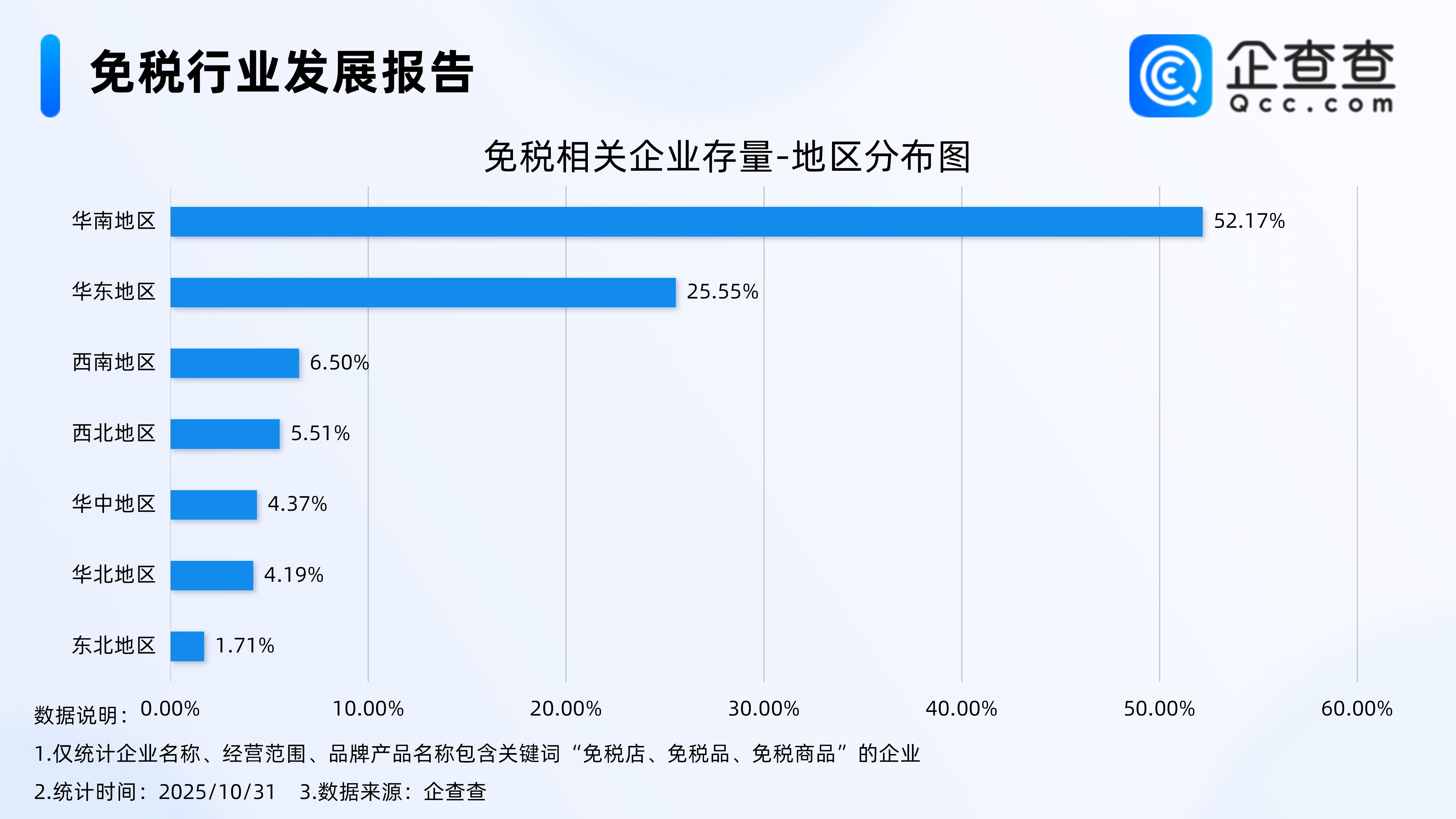 企查查数据显示,从地区分布来看,免税相关企业具有高度地域集中性,分布在华南地区的相关企业占比过半,达52.17%。其次,分布在华东地区的相关企业占比25.55%。