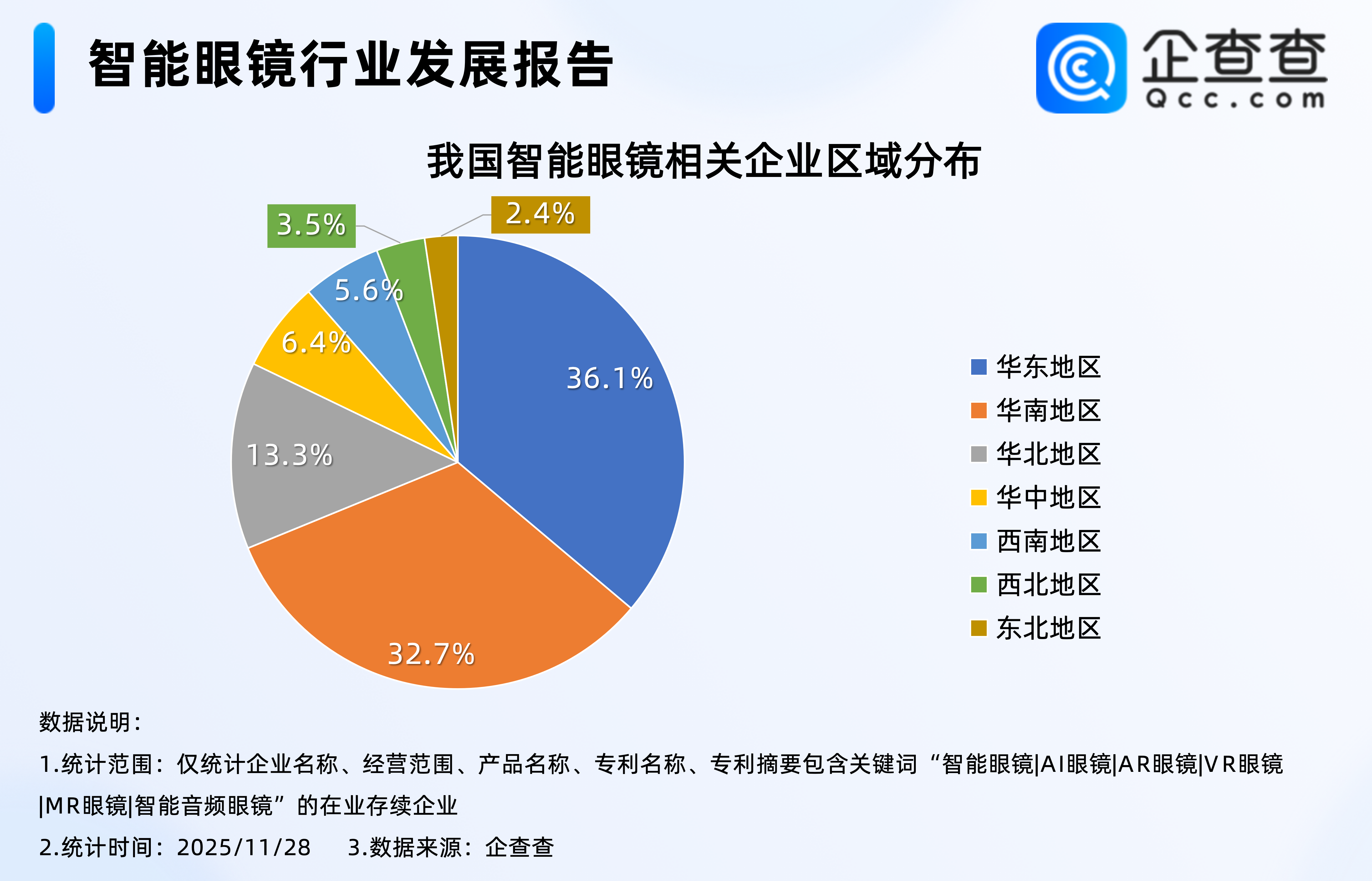 企查查数据显示,区域分布上,华东地区现存智能眼镜相关企业最多,占全国总存量的36.1%,其次是华南地区,占比32.7%,西北、东北地区相对最少,分占3.5%、2.4%。
