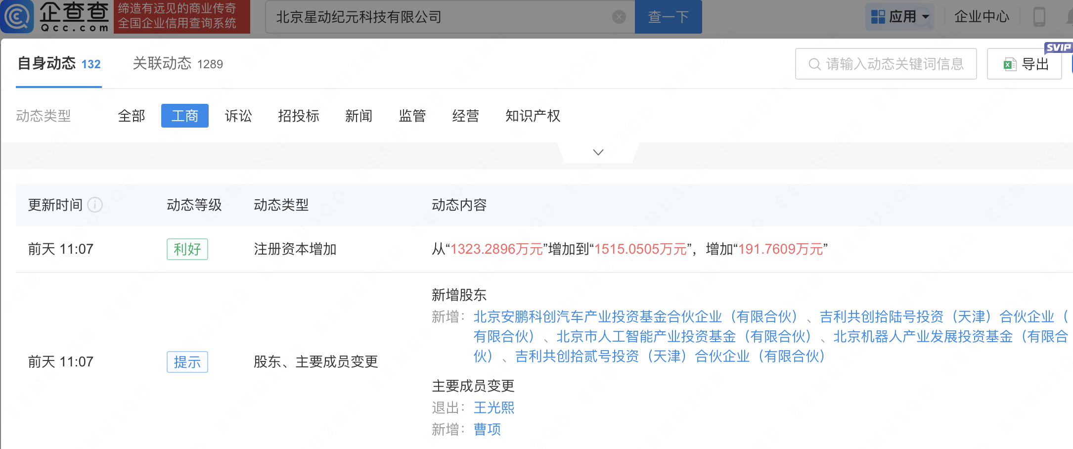 企查查APP显示,近日,北京星动纪元科技有限公司发生工商变更,新增吉利共创拾贰号投资(天津)合伙企业(有限合伙)、吉利共创拾陆号投资(天津)合伙企业(有限合伙)、北京市人工智能产业投资基金(有限合伙)等为股东,同时注册资本增至1515.05万元。企查查信息显示,该公司成立于2023年,经营范围包含智能机器人的研发;服务消费机器人销售;智能机器人销售;人工智能基础软件开发等。据其官网,星动纪元是一家人形机器人公司。
