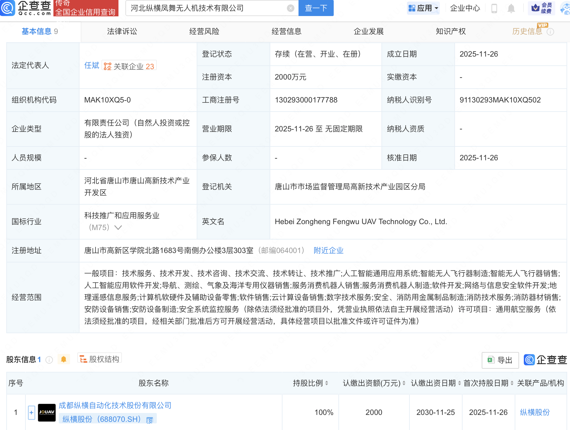 企查查APP显示,近日,河北纵横凤舞无人机技术有限公司成立,注册资本2000万元,经营范围包含:人工智能通用应用系统;智能无人飞行器制造;智能无人飞行器销售;人工智能应用软件开发等。企查查股权穿透显示,该公司由纵横股份(688070)全资持股。