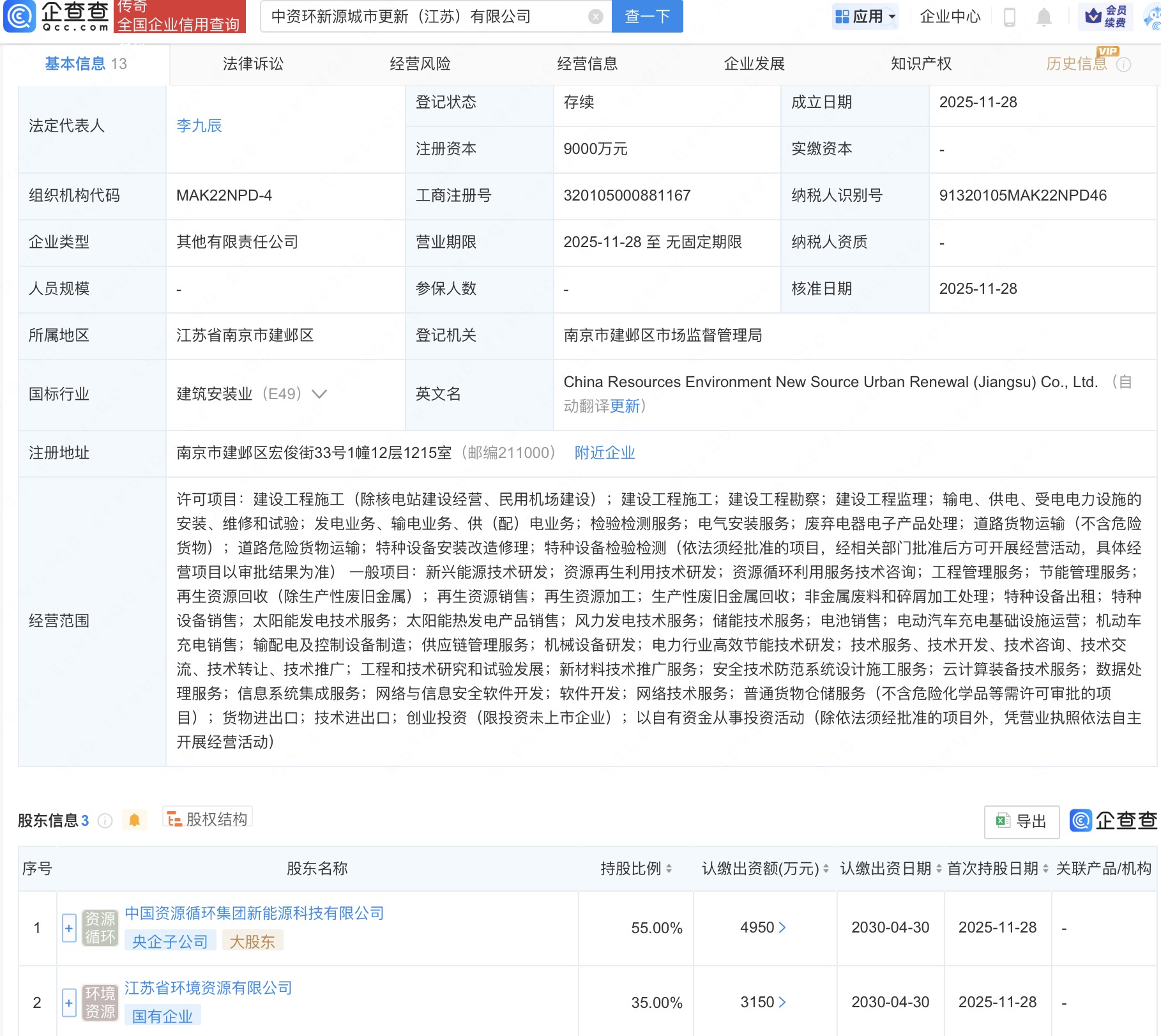 企查查APP显示,近日,中资环新源城市更新(江苏)有限公司成立,法定代表人为李九辰,注册资本9000万人民币,经营范围包括建设工程施工、建设工程勘察、建设工程监理、资源再生利用技术研发等。企查查股权穿透显示,该公司由中国资源循环集团新能源科技有限公司、江苏省环境资源有限公司等共同持股。