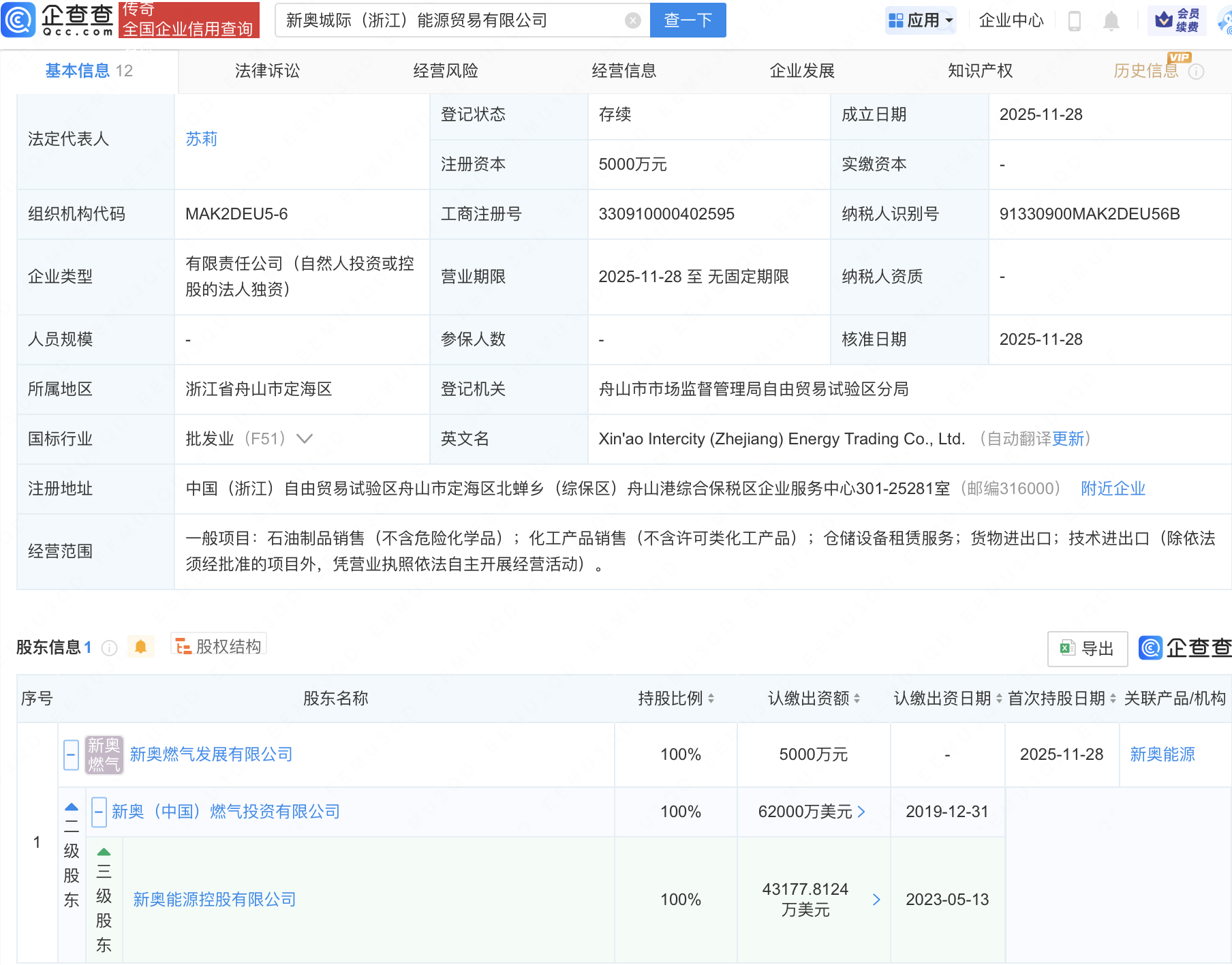 企查查APP显示,近日,新奥城际(浙江)能源贸易有限公司成立,注册资本5000万元,经营范围包含:仓储设备租赁服务;货物进出口;技术进出口等。企查查股权穿透显示,该公司由新奥能源(02688.HK)间接全资持股。