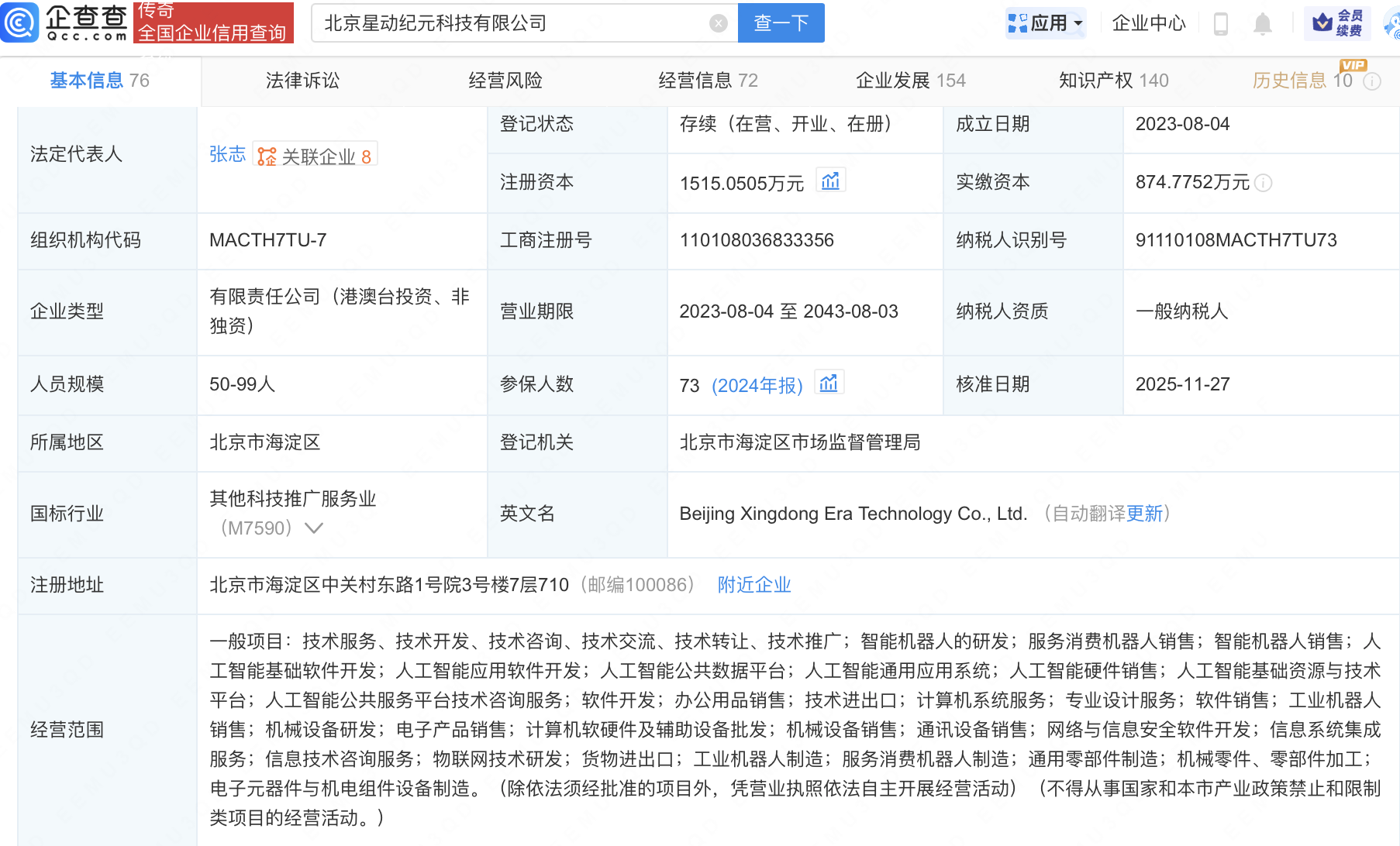 企查查APP显示,近日,北京星动纪元科技有限公司发生工商变更,新增吉利共创拾贰号投资(天津)合伙企业(有限合伙)、吉利共创拾陆号投资(天津)合伙企业(有限合伙)、北京市人工智能产业投资基金(有限合伙)等为股东,同时注册资本增至1515.05万元。企查查信息显示,该公司成立于2023年,经营范围包含智能机器人的研发;服务消费机器人销售;智能机器人销售;人工智能基础软件开发等。据其官网,星动纪元是一家人形机器人公司。