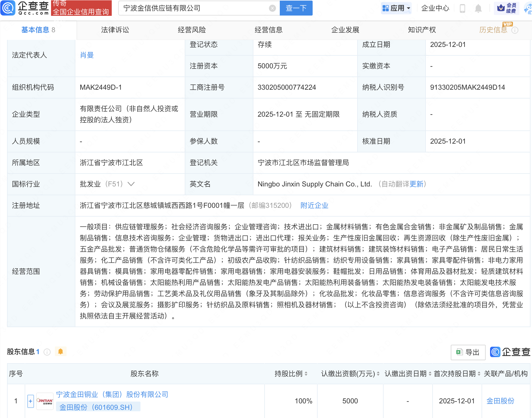企查查APP显示,近日,宁波金信供应链有限公司成立,注册资本5000万元,经营范围包含:供应链管理服务;太阳能热利用产品销售;太阳能热发电产品销售;太阳能热利用装备销售等。企查查股权穿透显示,该公司由金田股份(601609)全资持股。