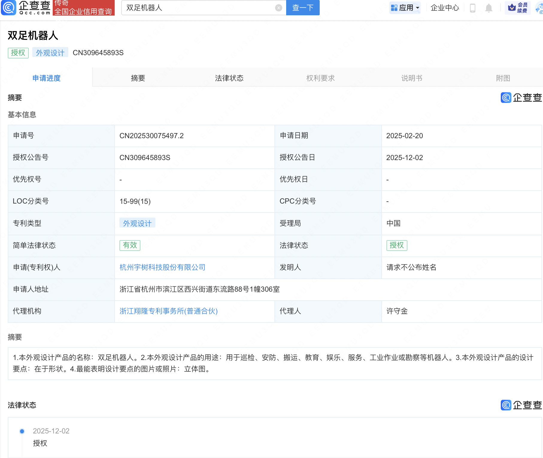 企查查APP显示,近日,杭州宇树科技股份有限公司“双足机器人”专利获授权。企查查专利摘要显示,本外观设计产品用途用于巡检、安防、搬运、教育、娱乐、服务、工业作业或勘察等机器人,其设计要点在于形状。