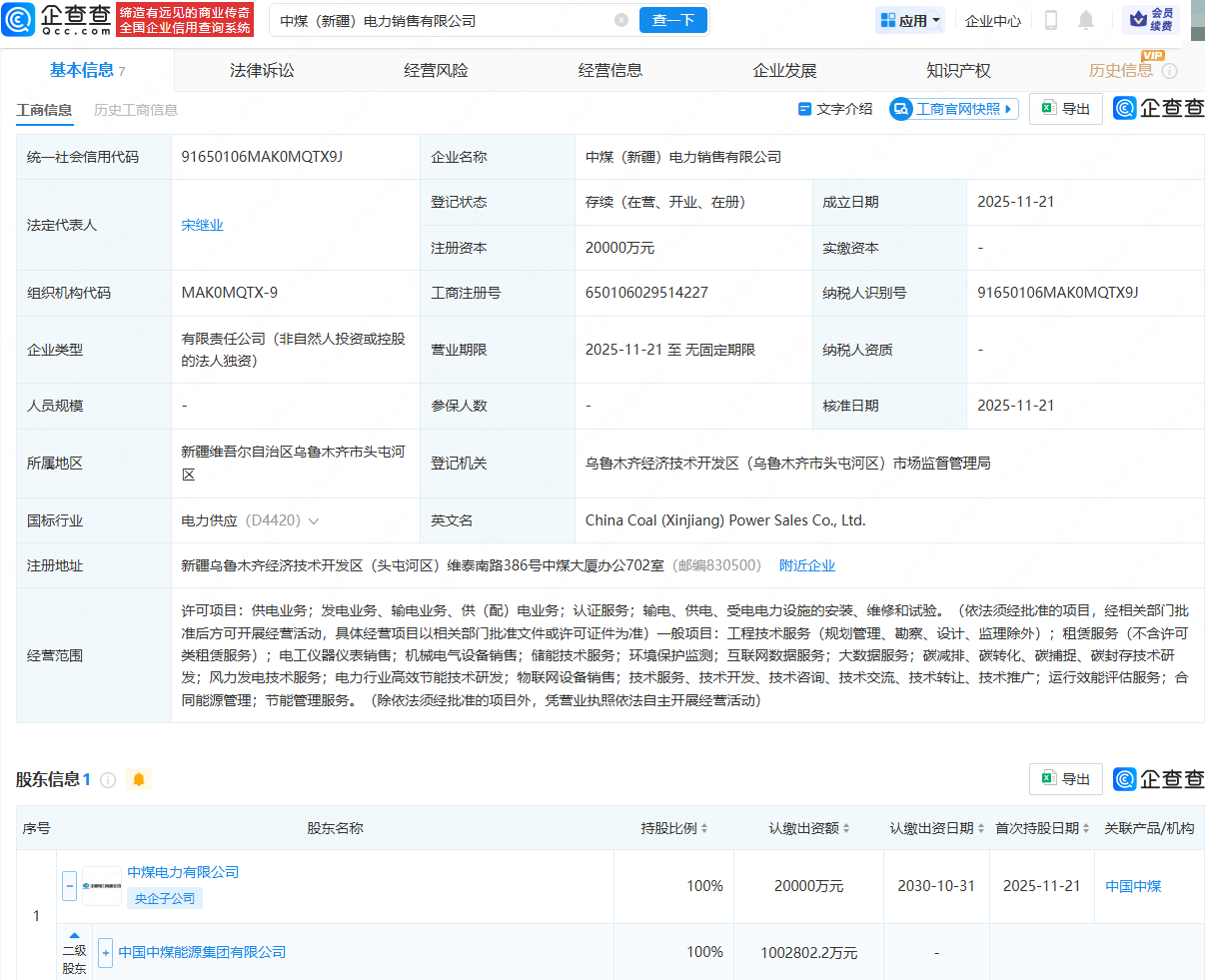 企查查APP显示,近日,中煤(新疆)电力销售有限公司成立,法定代表人为宋继业,注册资本为2亿元,经营范围包含:供电业务;发电业务、输电业务、供(配)电业务;储能技术服务;环境保护监测等。企查查股权穿透显示,该公司由中国中煤旗下中煤电力有限公司全资持股。