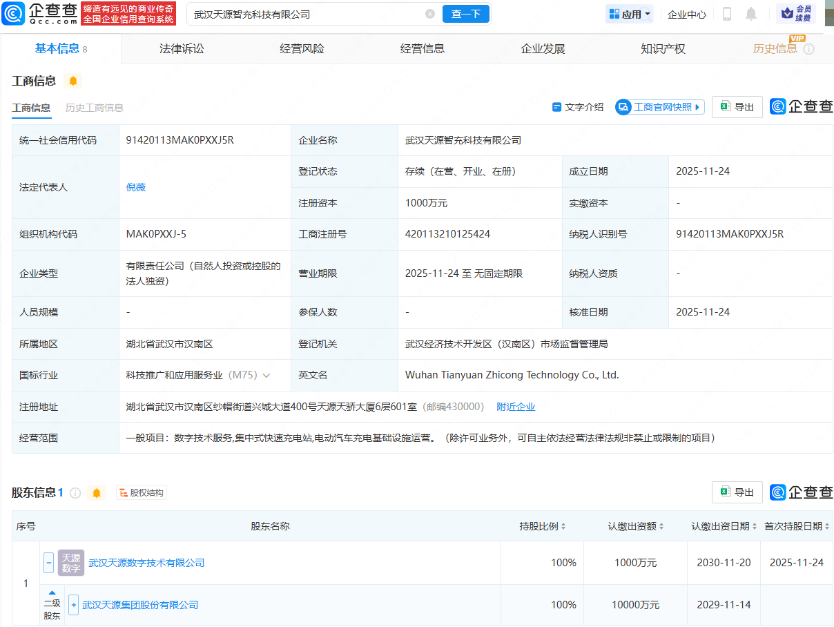 企查查APP显示,近日,武汉天源智充科技有限公司成立,法定代表人为倪薇,注册资本为1000万元,经营范围包含:数字技术服务;集中式快速充电站;电动汽车充电基础设施运营。企查查股权穿透显示,该公司由武汉天源(301127)间接全资持股。