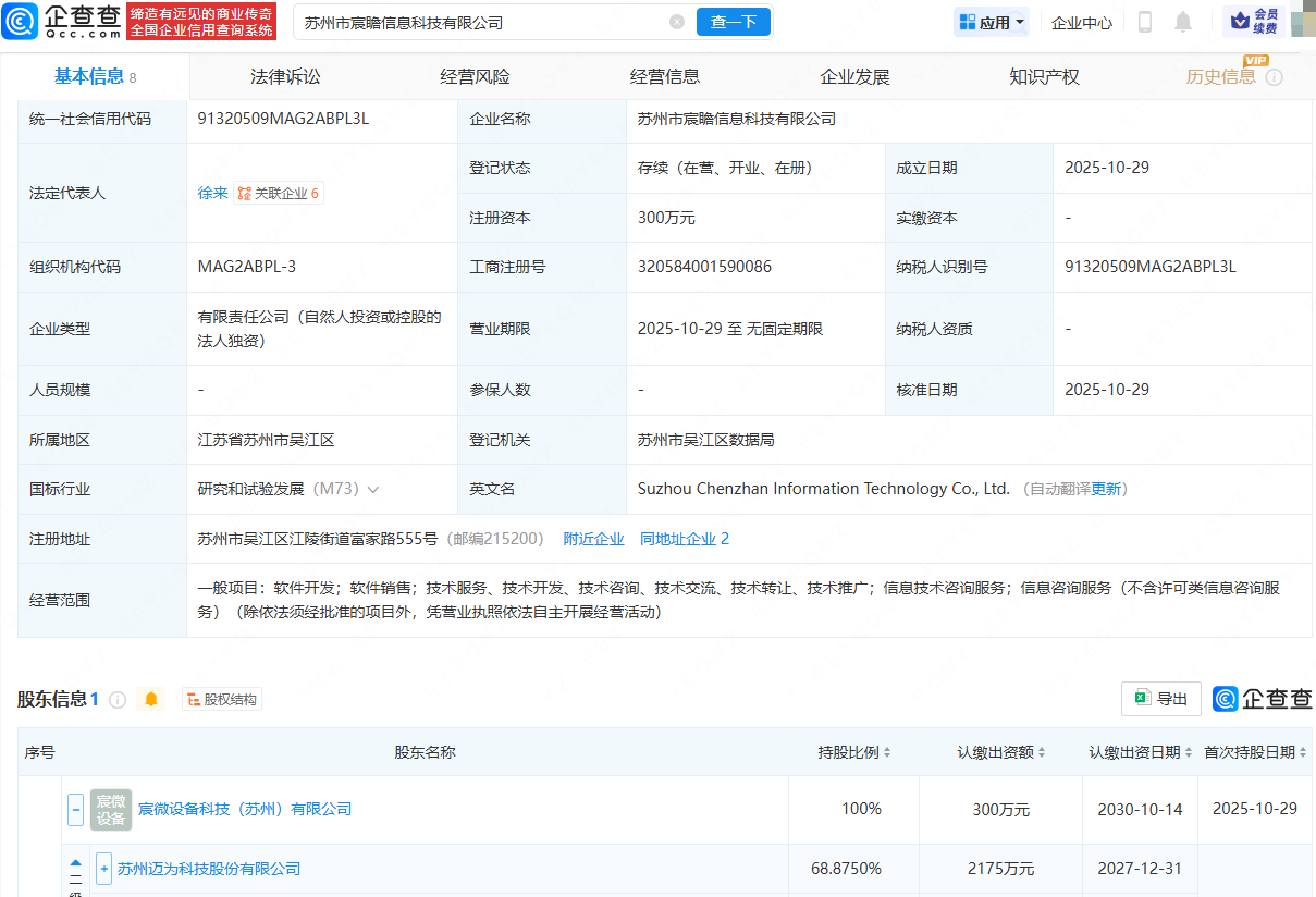 企查查APP显示,近日,苏州市宸瞻信息科技有限公司成立,法定代表人为徐来,经营范围包含:软件开发;软件销售;信息技术咨询服务;信息咨询服务等。企查查股权穿透显示,该公司由迈为股份(300751)旗下宸微设备科技(苏州)有限公司全资持股。