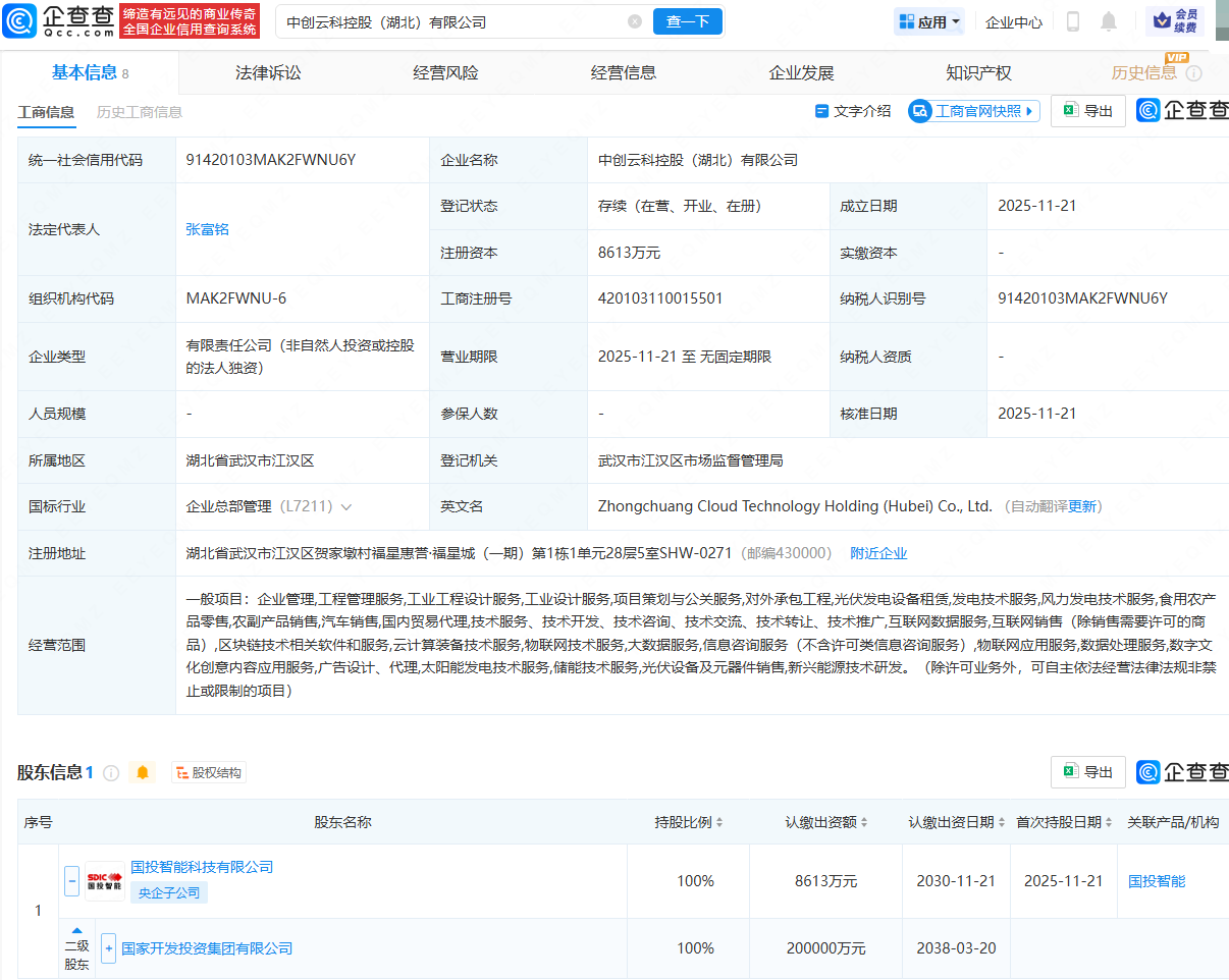 企查查APP显示,近日,中创云科控股(湖北)有限公司成立,法定代表人为张富铭,注册资本为8613万元,经营范围包含:光伏发电设备租赁,发电技术服务,风力发电技术服务,汽车销售,储能技术服务等。企查查股权穿透显示,该公司由国家开发投资集团有限公司旗下国投智能科技有限公司全资持股。