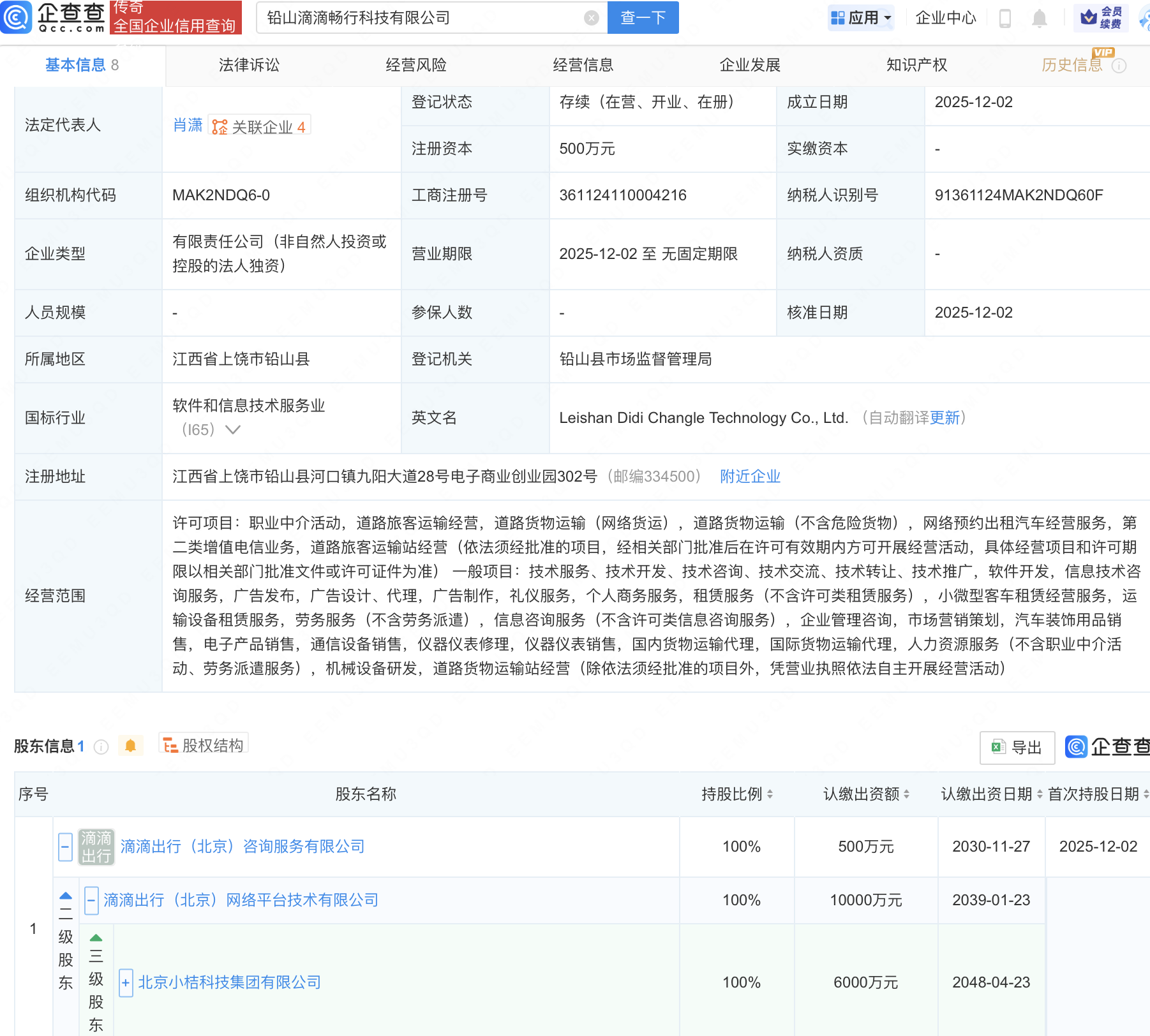 企查查APP显示,近日,铅山滴滴畅行科技有限公司成立,经营范围包含:小微型客车租赁经营服务,运输设备租赁服务,劳务服务(不含劳务派遣)等。企查查股权穿透显示,该公司由滴滴出行关联公司北京小桔科技集团有限公司间接全资持股。