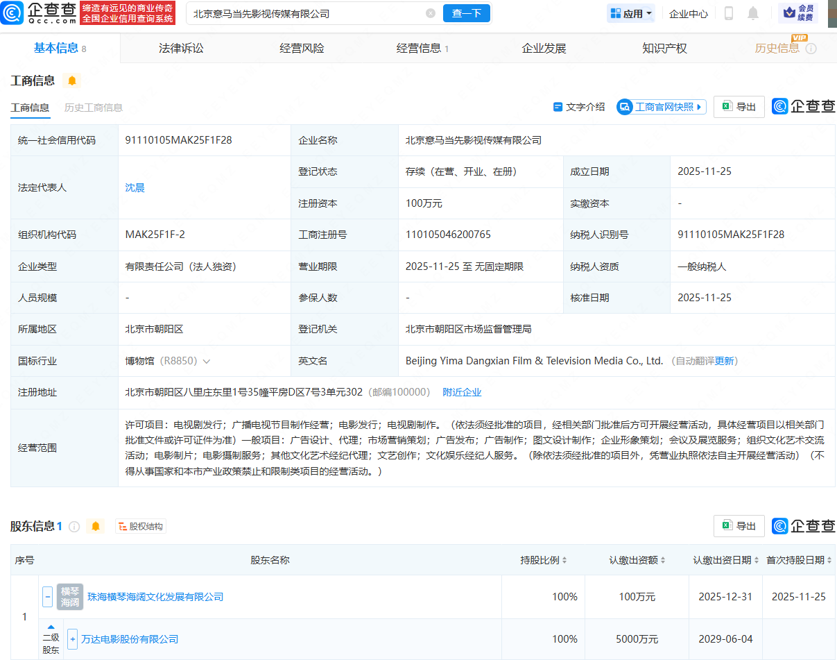 企查查APP显示,近日,北京意马当先影视传媒有限公司成立,法定代表人为沈晨,经营范围包含:电视剧发行;广播电视节目制作经营;电影发行;电视剧制作;电影制片;电影摄制服务等。企查查股权穿透显示,该公司由万达电影(002739)间接全资持股。