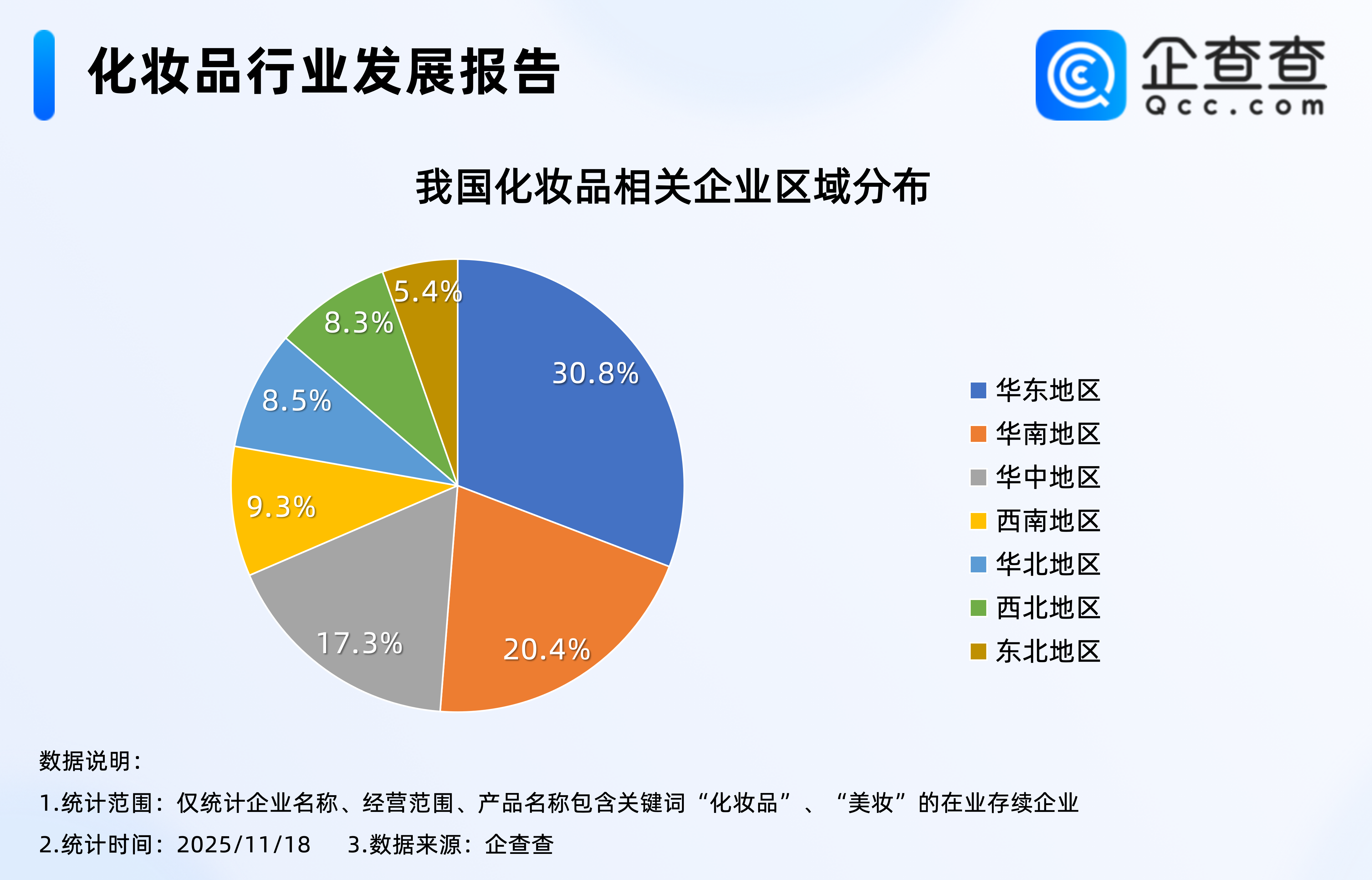 企查查数据显示,截至11月18日,我国现存2139.8万家化妆品相关企业,区域分布上,华东地区最多,占比超30%,其次为华南地区、华中地区;注册量方面,2025年以来,我国已注册424.9万家化妆品相关企业,其中分布在华东地区的相关企业最多,占比达27%。